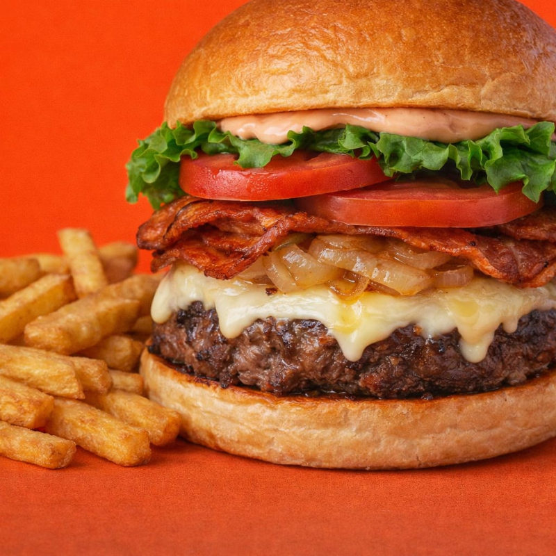 Deliciosa carne de res de ¼ de libra, jugosa y perfectamente sellada, acompañada de queso manchego blanco que aporta un toque cremoso y lleno de sabor. Se complementa con cebolla caramelizada, tocino crujiente, lechuga fresca y tomate recién cortado. Todo coronado con nuestro aderezo especial de la casa y servido en un pan brioche suave y ligeramente dorado. Una combinación única que conquista.