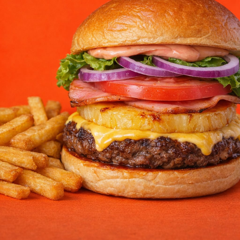 medallon de carne jugosa, queso amarillo, reabanada de jamon, rebanada de piña ligeramente asada,cebolla morada, lechuga y tomate, todo esto montado sobre pan brioche acompañado de papas fritas y refresco de 250 ml