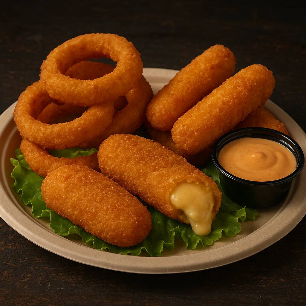Una combinacion irresistible de 5 aros de cebolla, 3 dedos de queso mozzarella fundido y 2 jalapeño popper reyenos de queso cremoso todo acompañado de nuestro adhereso especial.