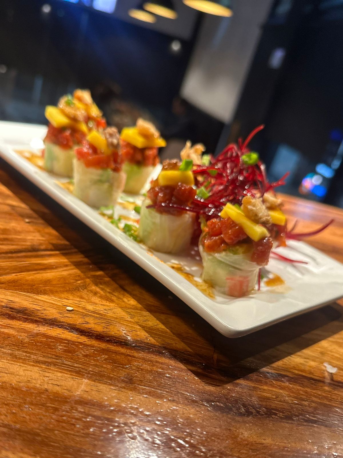 Hoja de arroz, lechuga, pepino, aguacate, camarón tempura, kanikama y mango; topping de pescado en cuadros, serrano, sumo de limón y salsa serranito.