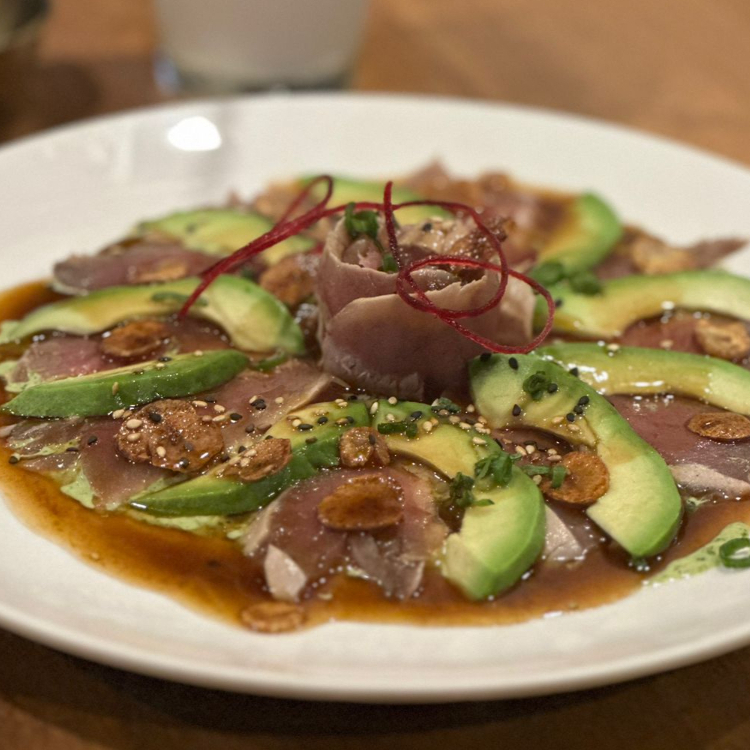 Corte fino de pescado fresco bañado en salsa ponzu.
