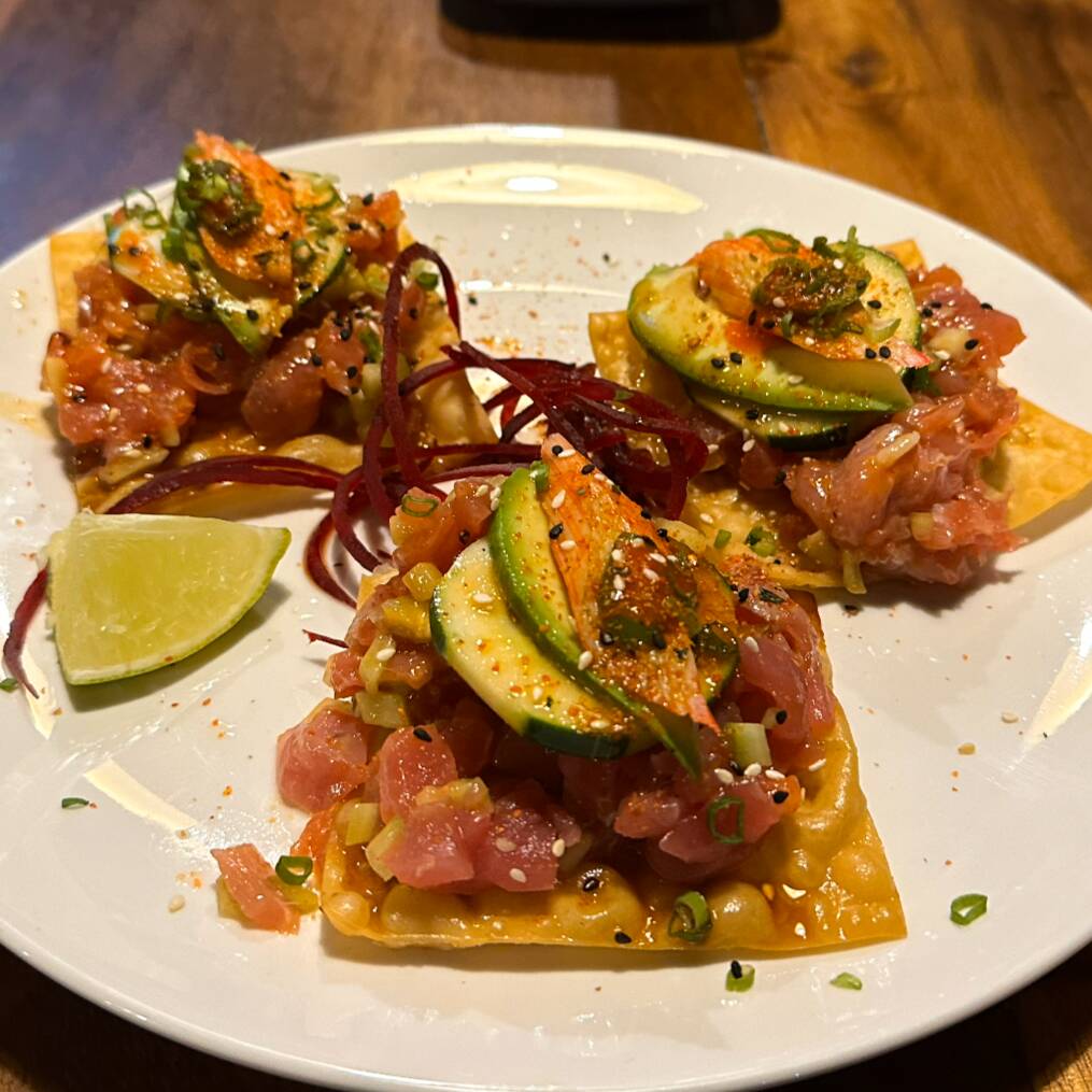 Spicy de pesca del día con pepino montadas en tostaditas de wonton con un toque de kanikama, aguacate, chile serrano y salsa spicy, bañadas en salsa de la casa, sal de grano y chile togarashi.