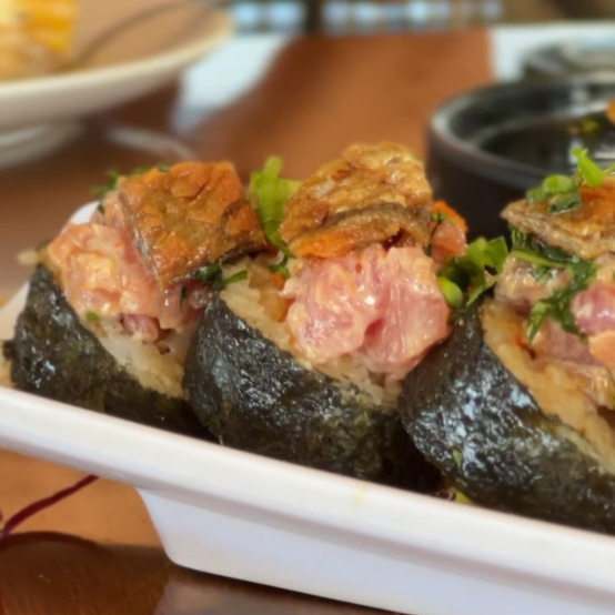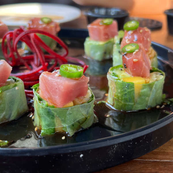Rollo sin arroz, montado en hoja de arroz, envuelto en pepino, atún o salmón, kanikama, masago, camarón tempura y aguacate. Ahogado en salsa del chef.
