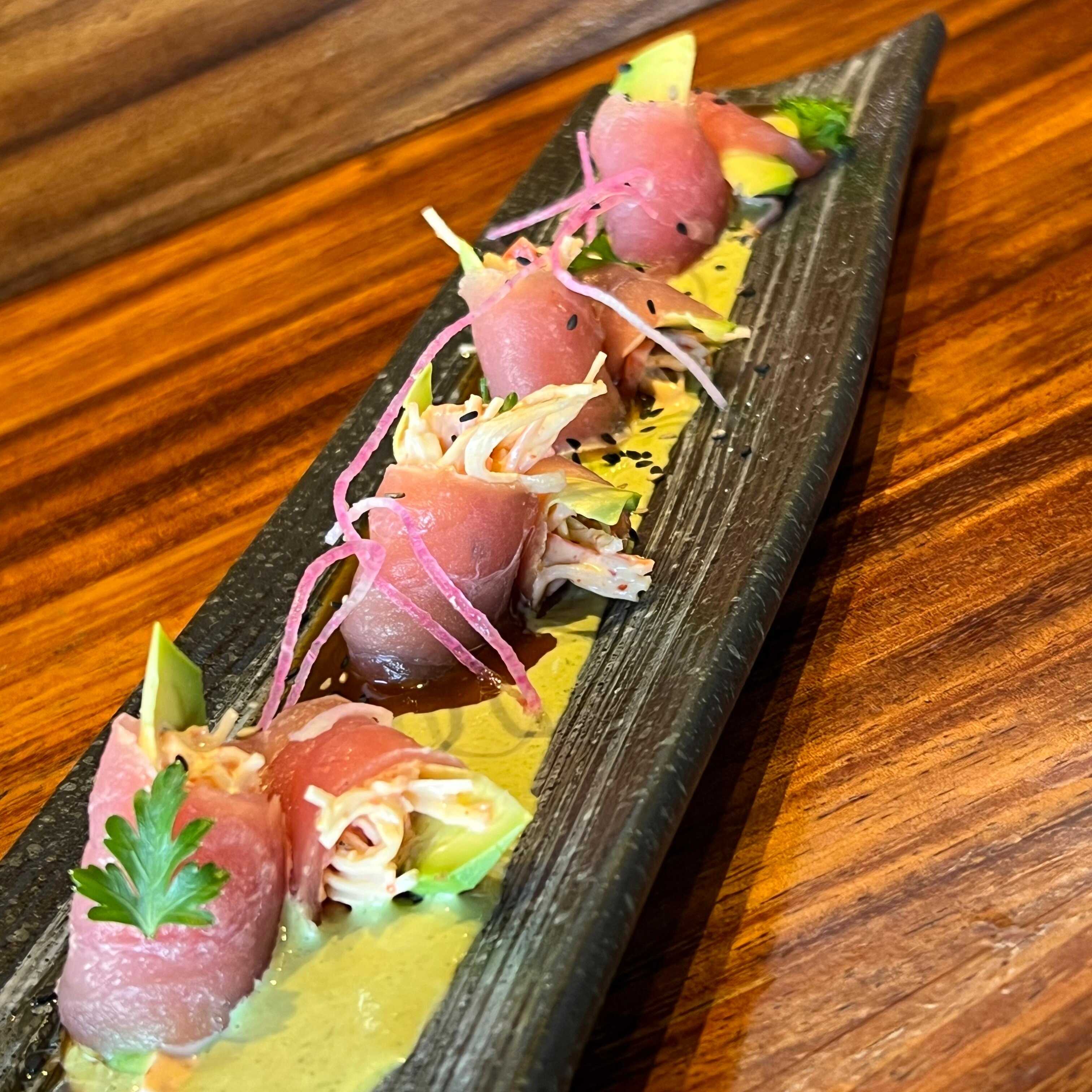 Spicy de atún y pepino. Forrado con láminas de atún y aguacate. Aderezado con salsa yuzu. Montado con cebolla crocante y salsa de la casa