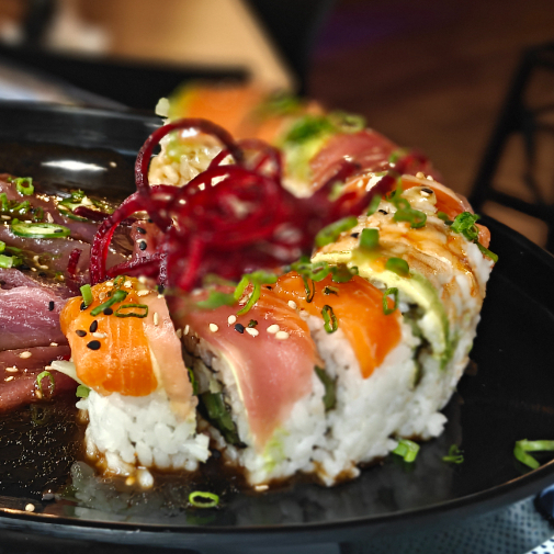 Pepino, queso crema y aguacate. Forrado de salmón, atún, kanikama, camarón y pesca del día. Bañado con salsa serranito.