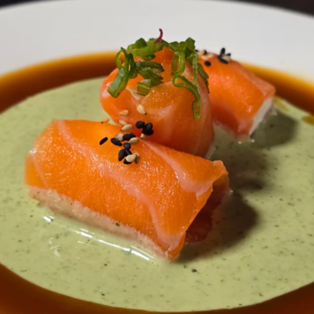 Finos cortes de salmón rellenos de queso crema con un toque de furikake, en espejo de salsa cilantro y toque de salsa de la casa.