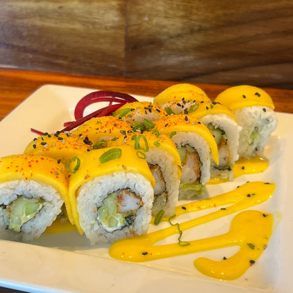 Camarón empanizado, pepino, aguacate y queso crema. Forrado de mango. Con espejo de salsa de mango y togarashi.