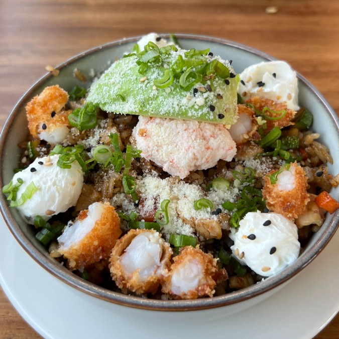 Arroz frito con vegetales a la plancha.