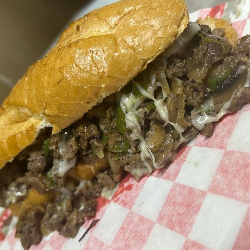 Carne de res acompañada de chile morron cebolla morada y champiñon con queso mozzarella fundido acompañado de papas