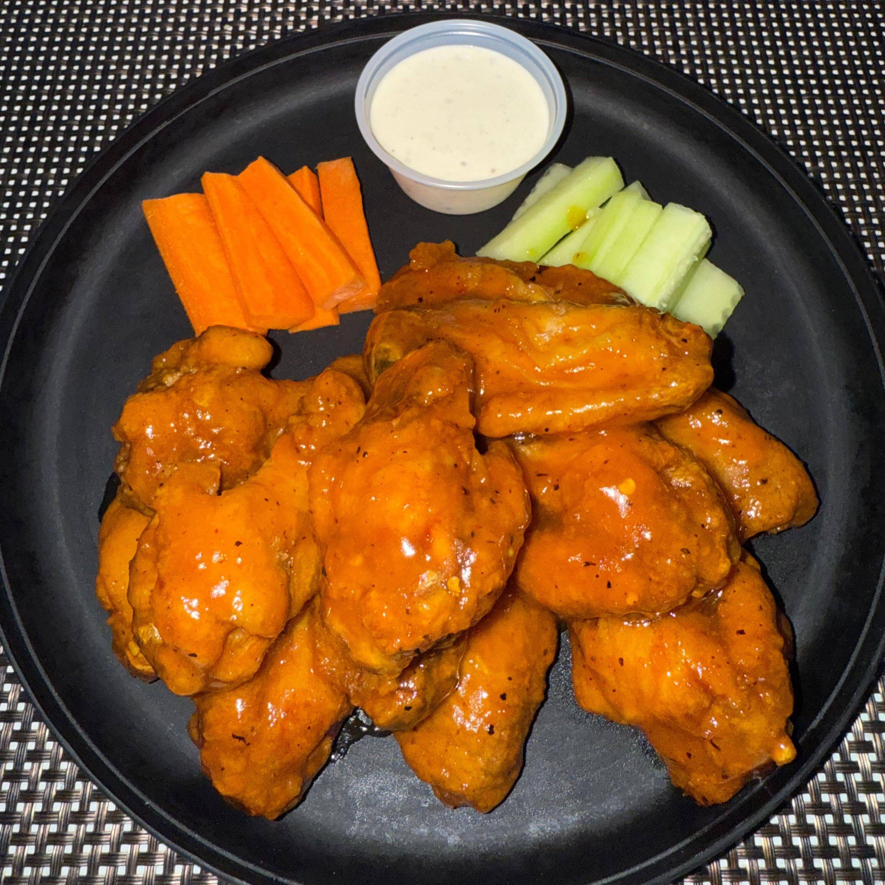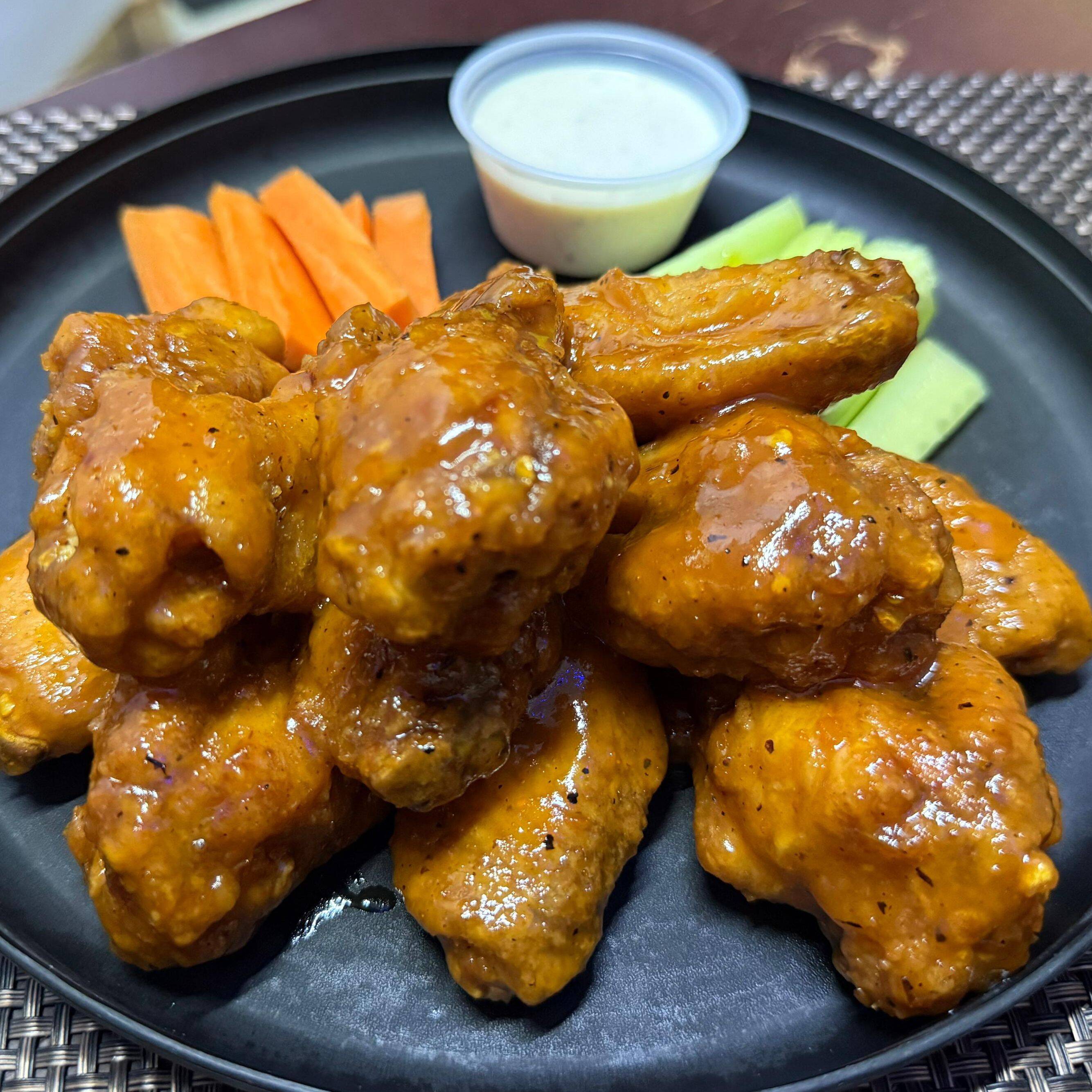 24 pzs de alitas de pollo bañadas en tu salsa favorita acompañadas de verduras y ranch