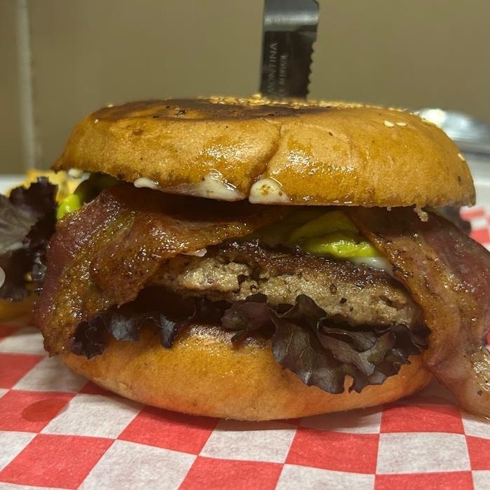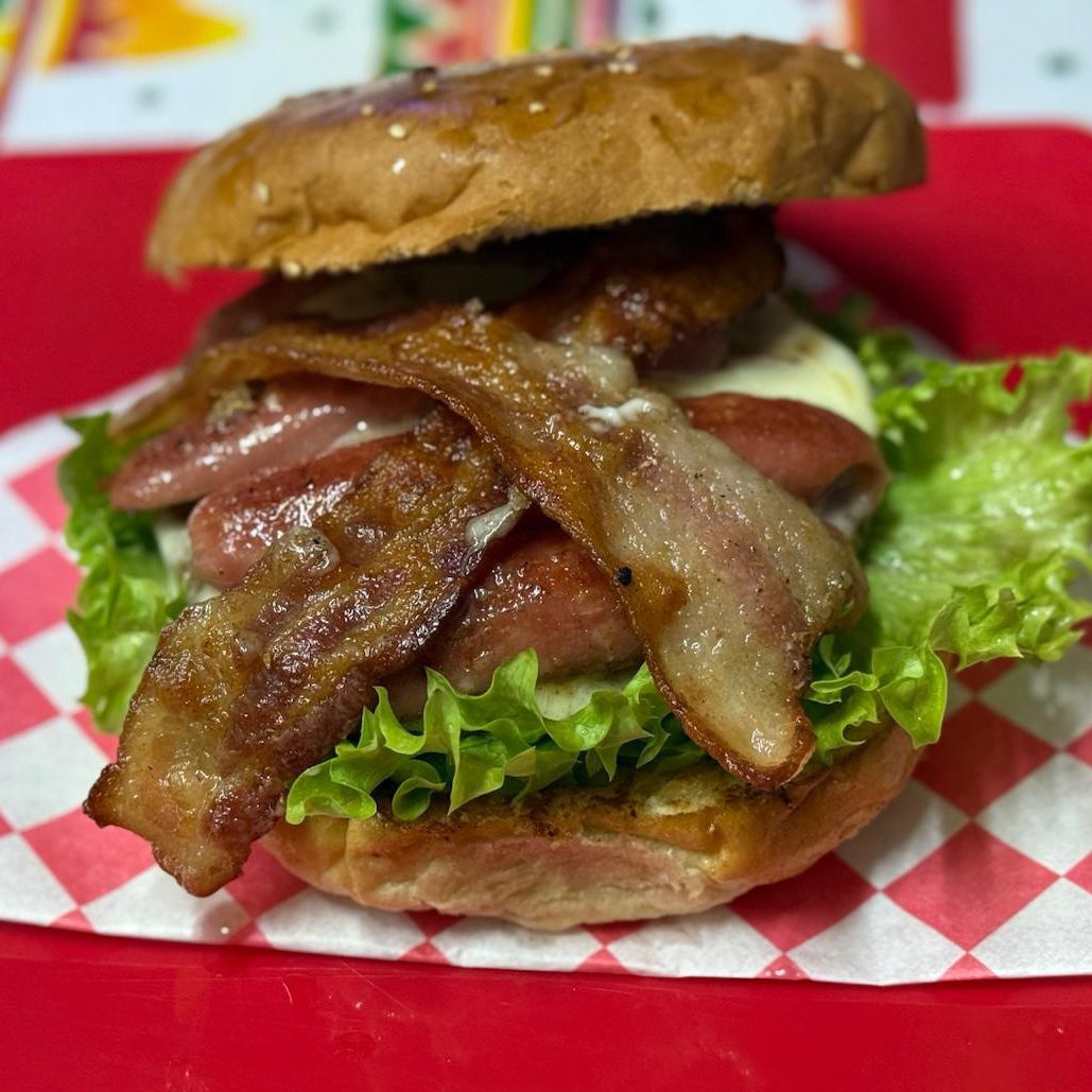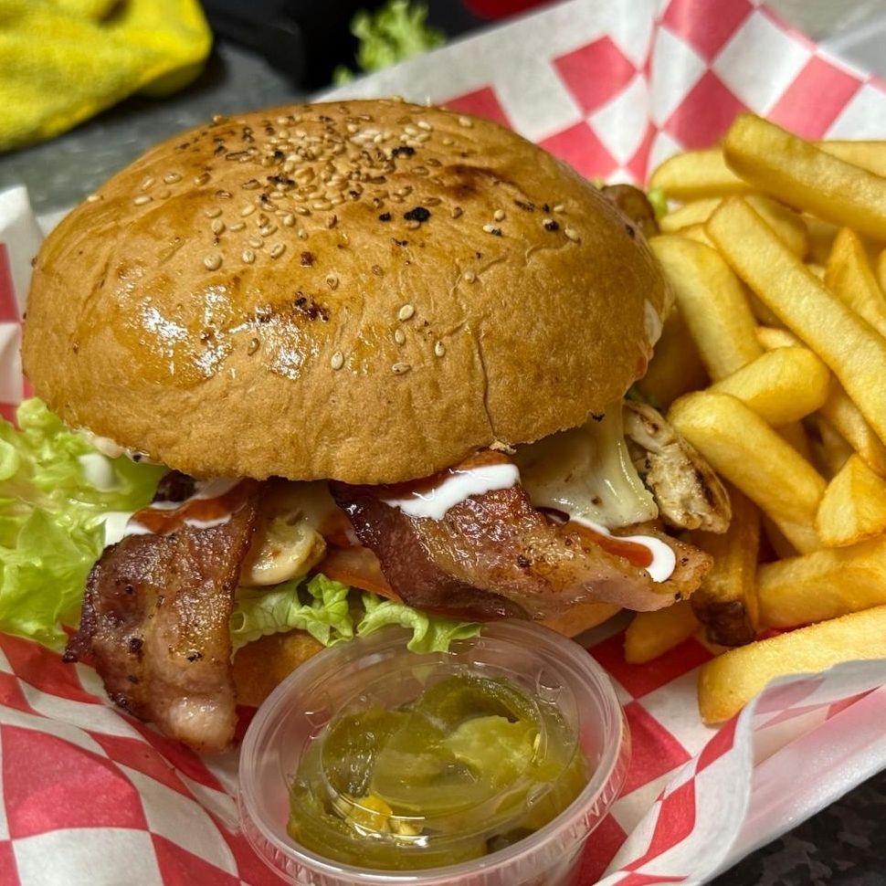 Carne de res,tocino y queso mozzarella, tomate,lechuga acompañada de papas