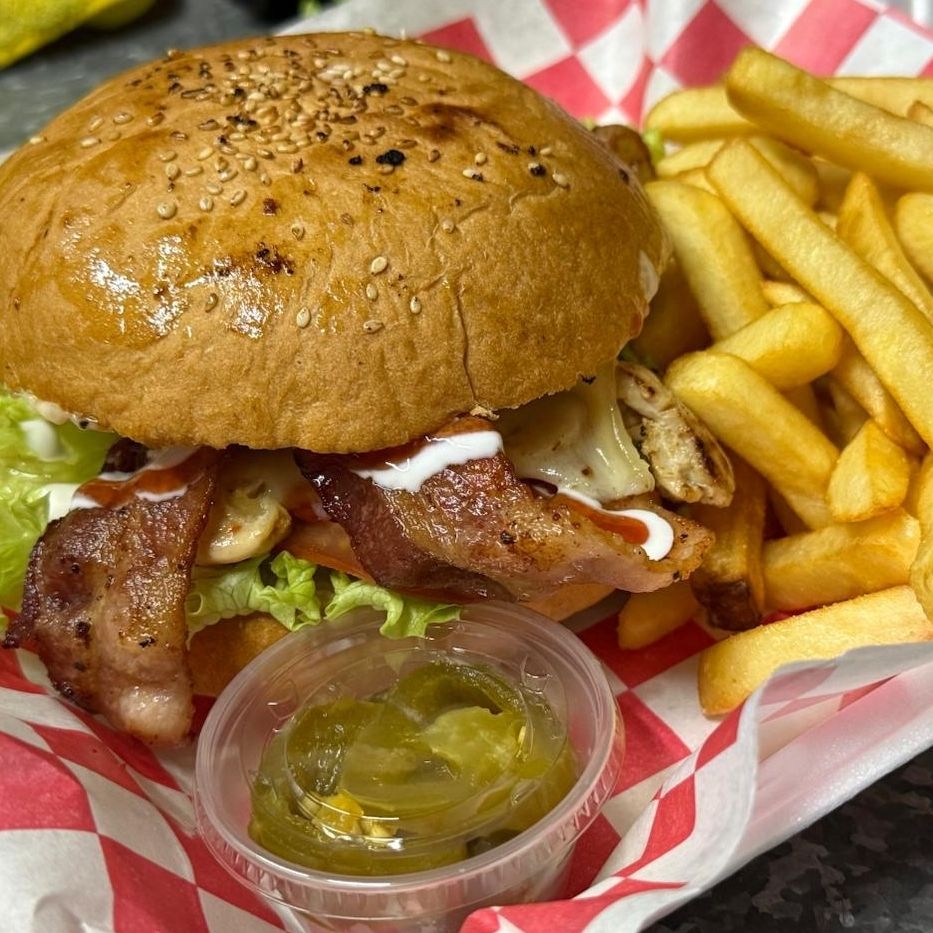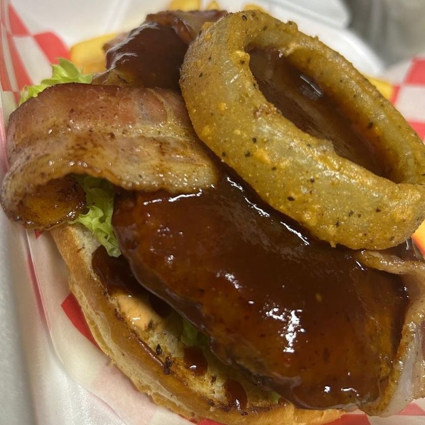 Carne de res, tocino, aros de cebolla bañada en salsa bbq, tomate y lechuga acompañada de papas