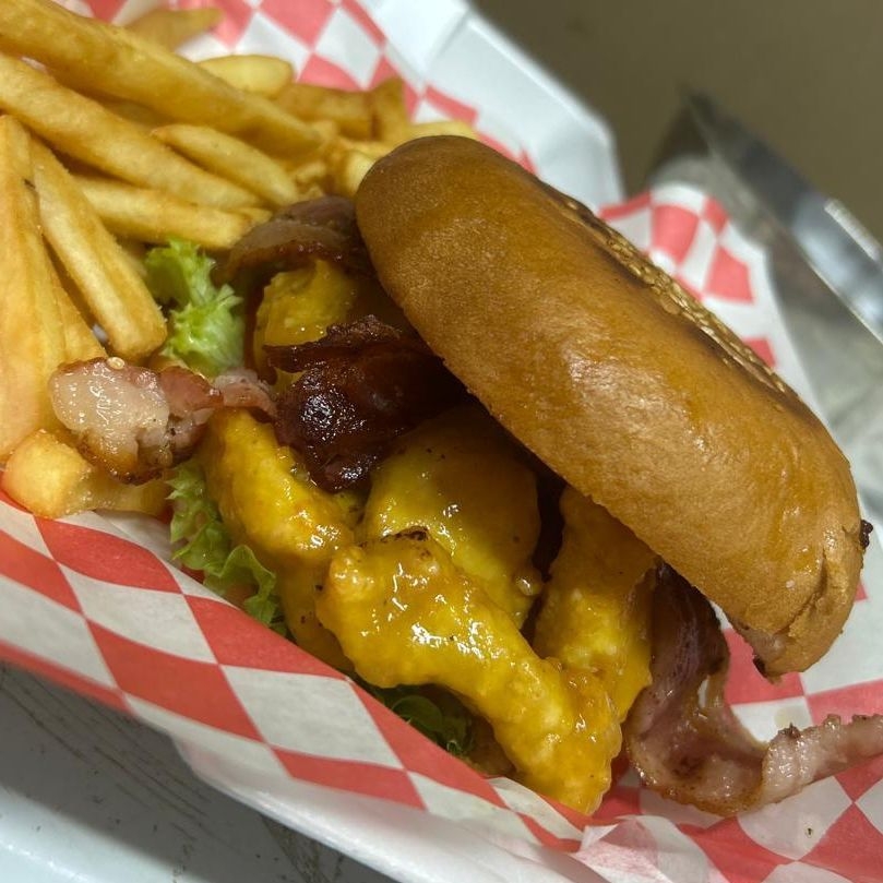 Tiras de pollo empanizadas bañadas en salsa de tu preferencia tocino,tomate y lechuga acompañada de papas