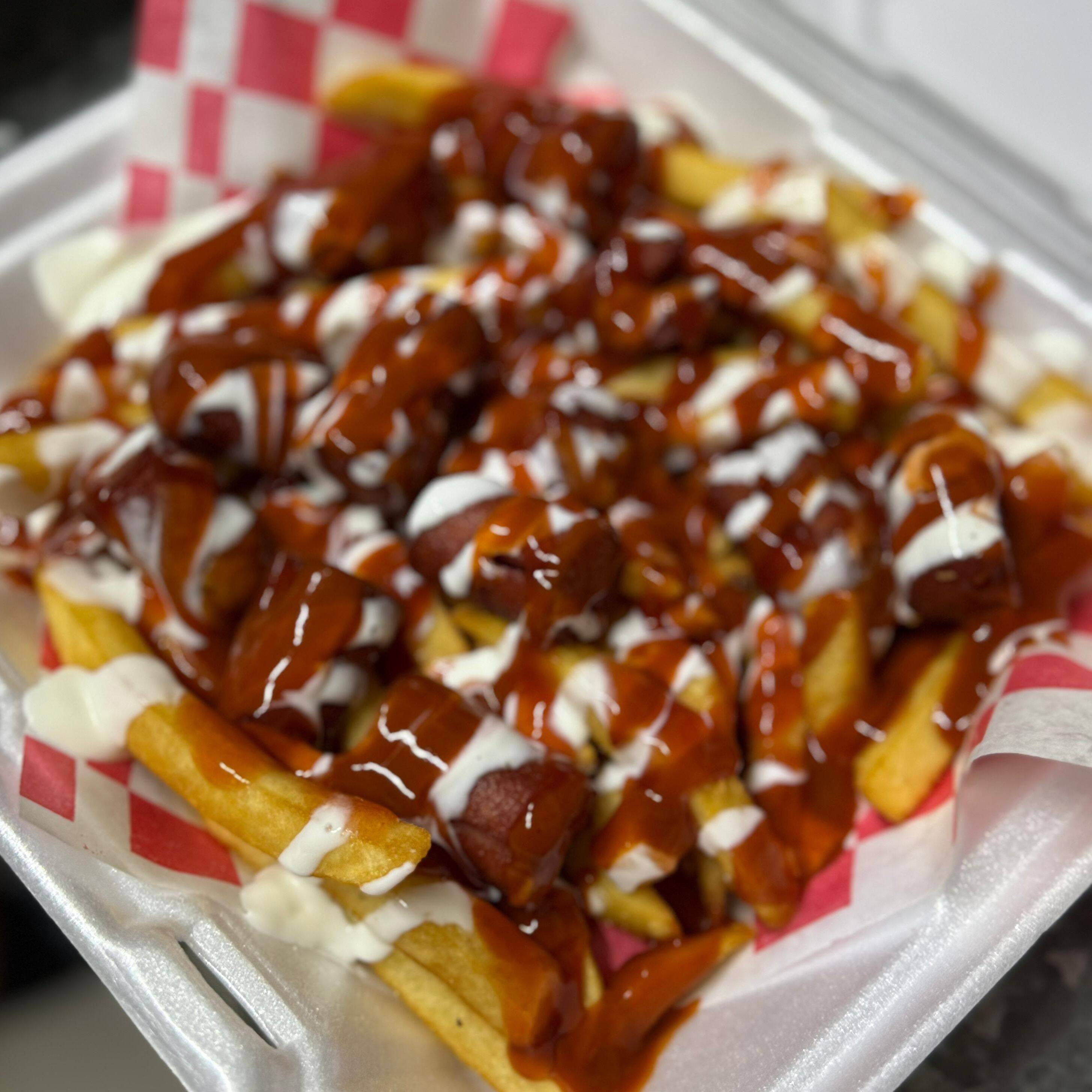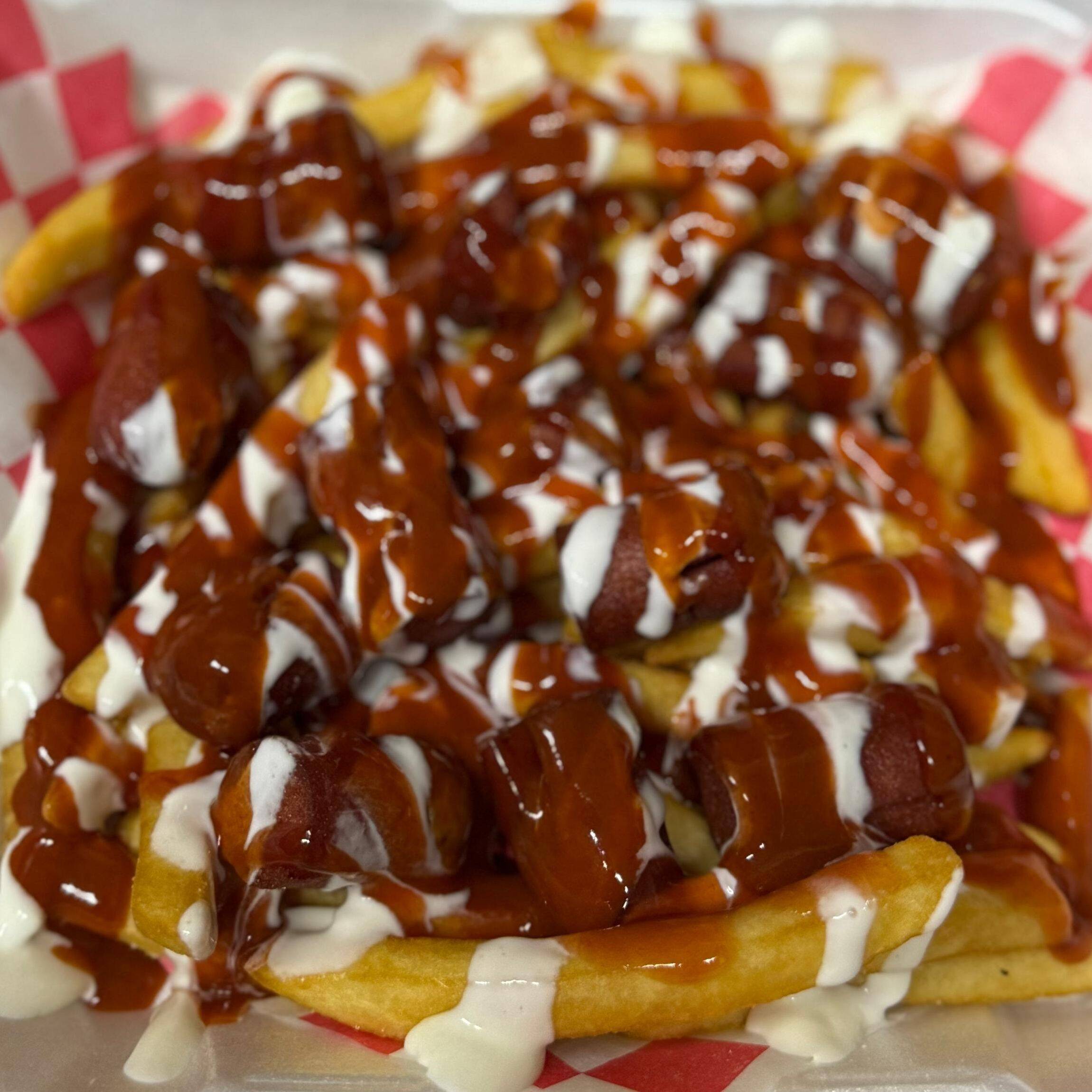 Orden de papas acompañadas de salchichas fritas bañadas con mayonesa crema catsup y salsa valentina