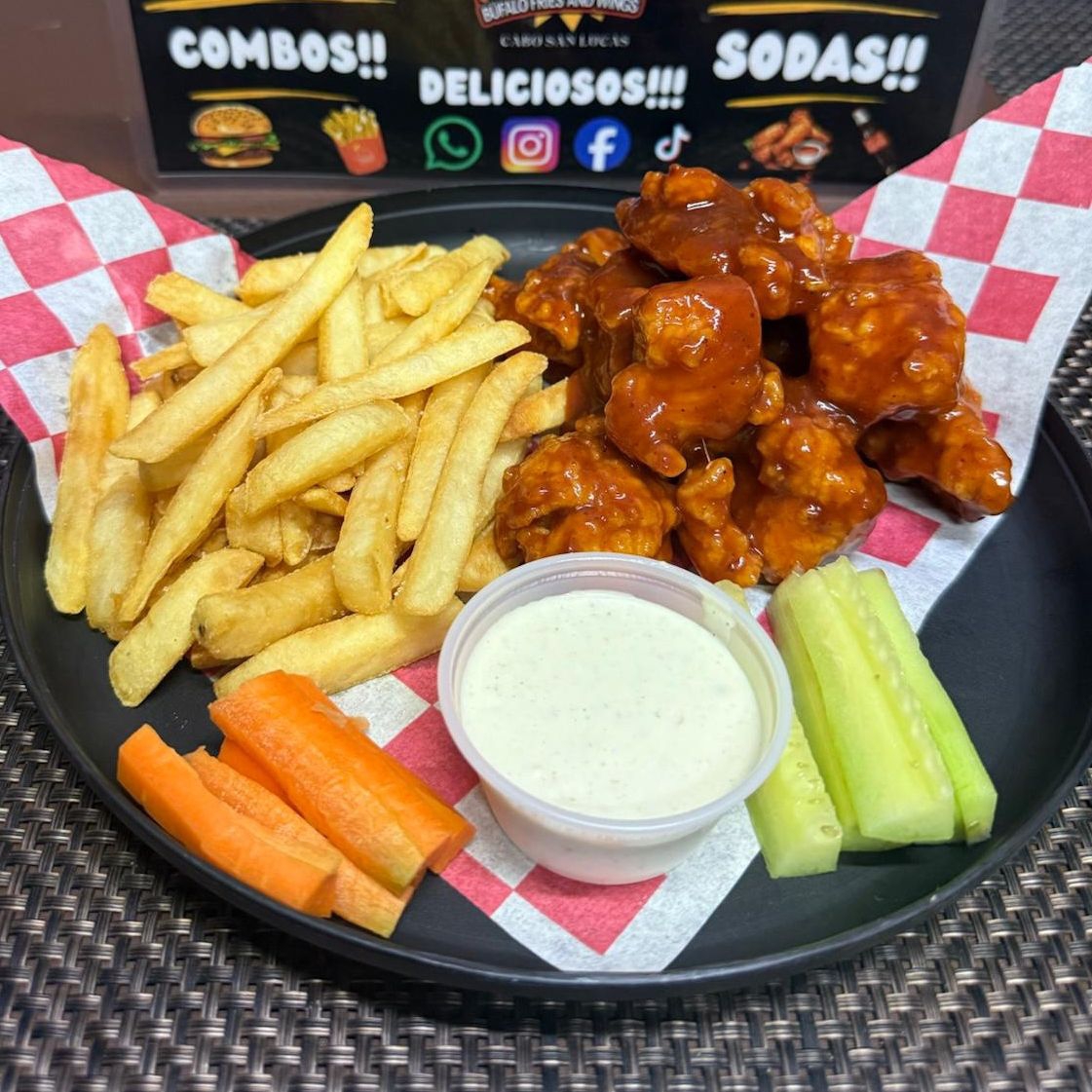 300gms de deliciosos boneles servidos con papas y acompañados con pepino ,zanahoria y aderezo ranch