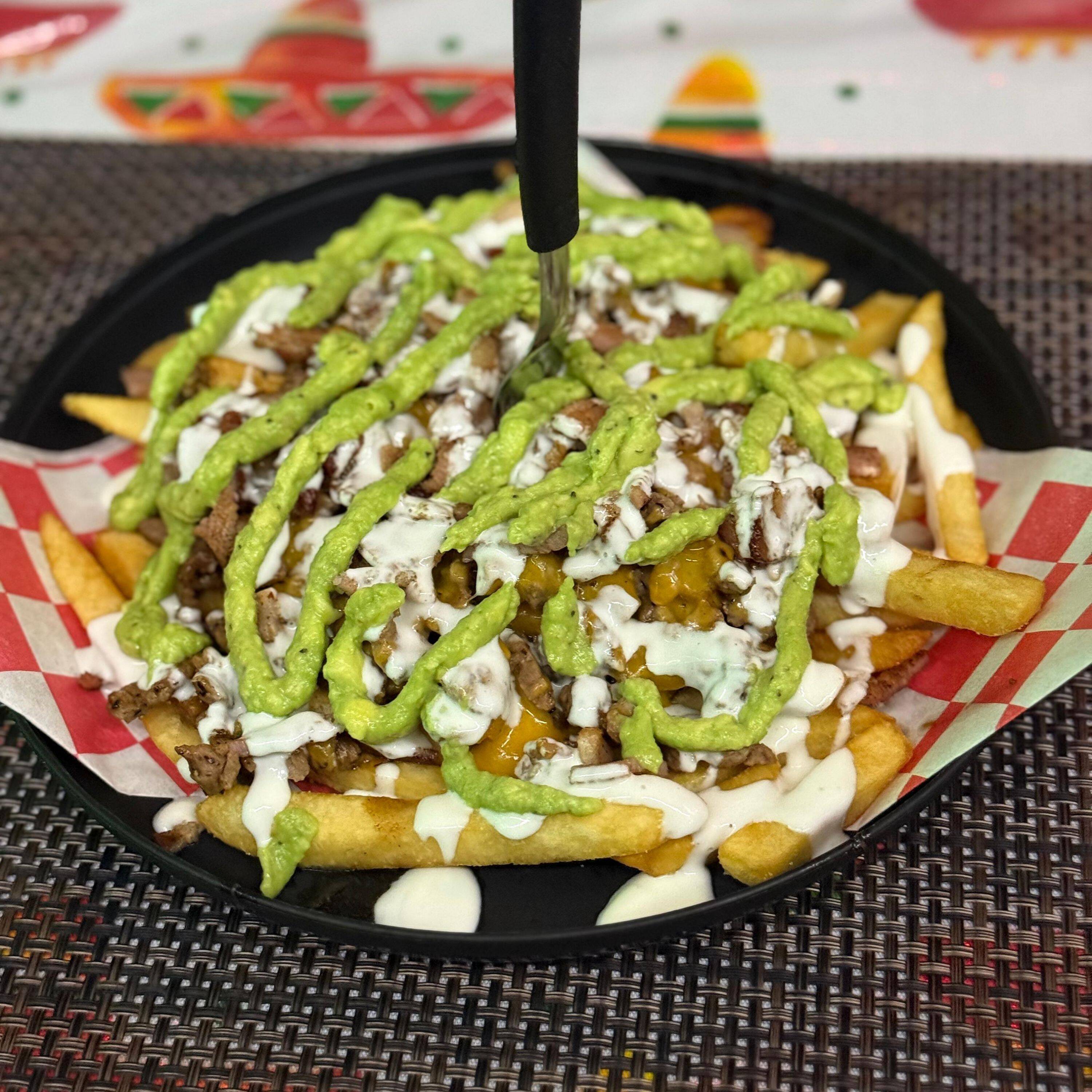 400g de papas acompañadas de carne asada bañadas en queso chedar,crema,guacamole y jalapeños