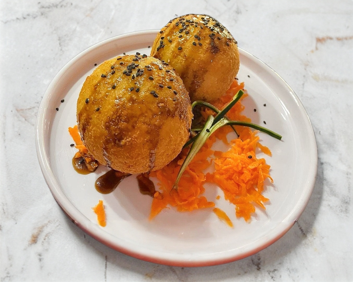 Arroz frito, zanahoria, calabaza y cebollín fianamente picado, montado en queso crema, kanicama, abanico de aguacate con aros de cebollas o verduritas tempura, salsa de anguila y un toque de ajonjolí