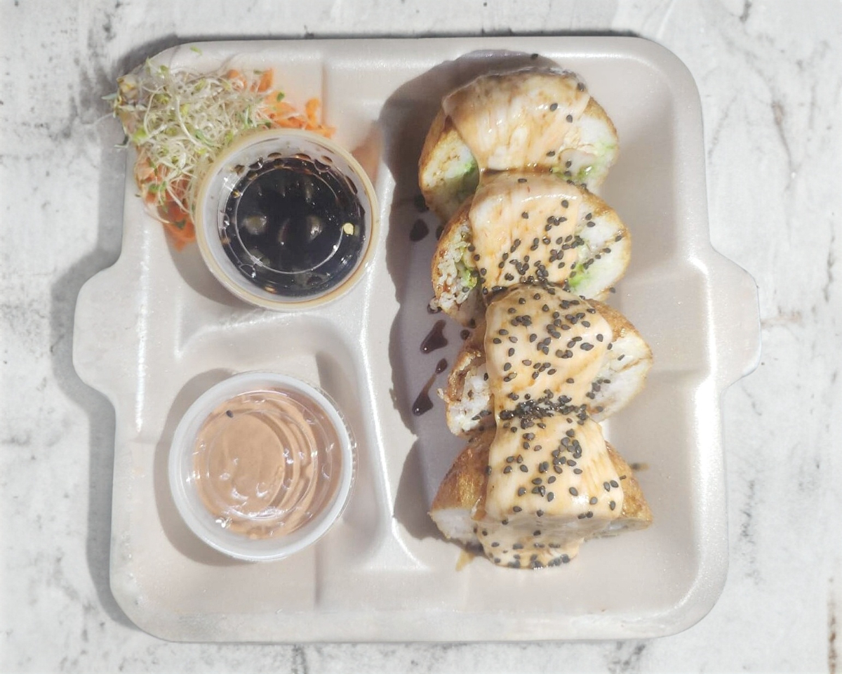 Por dentro kanicama, queso crema aguacate, por fuera camarón tempura, con un toque se salsa siracha y un toque de ajonjolí