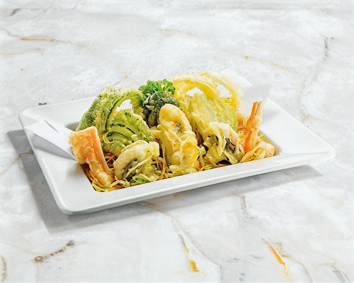 Proteína a escoger, fideos chino, delgadas tiras de algas, brocolí, zanahoria, cebollín y calabaza. (Camarón $205, Res $195, Pollo $195)