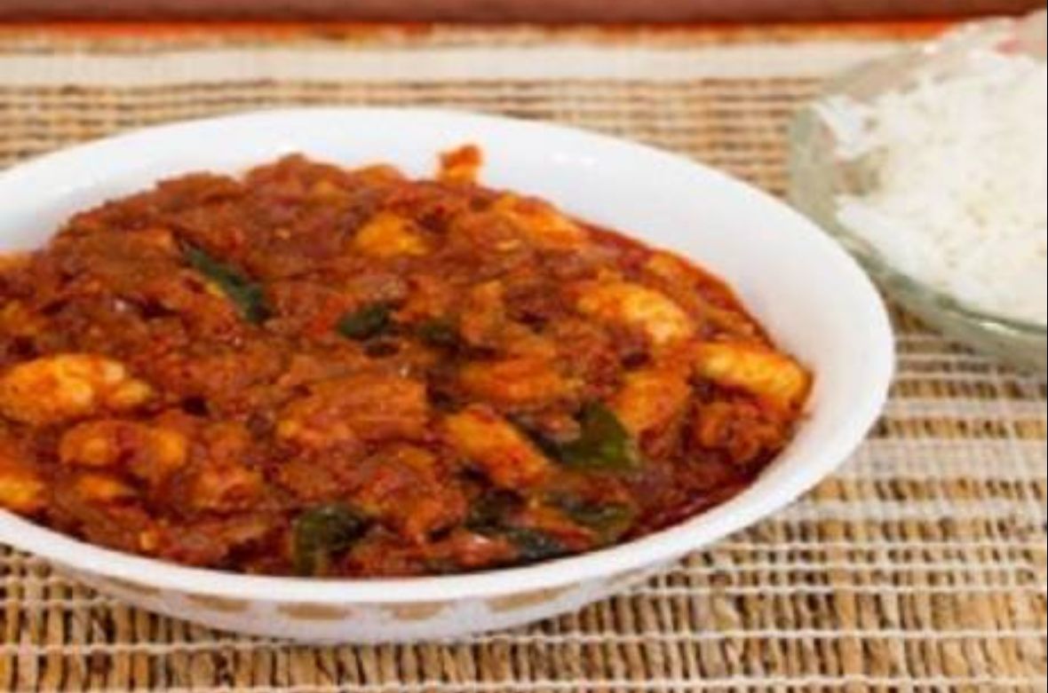 Camarones cocinado lentamente con gravy de espinacas y especias.