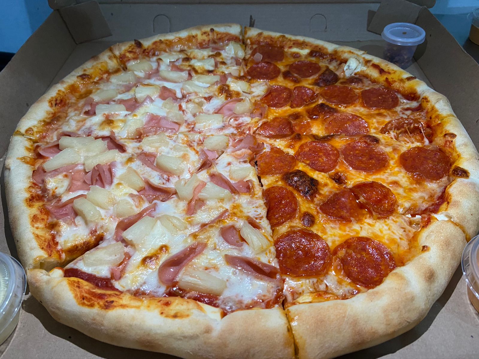 Carne molida, pepperoni, cebolla, chorizo y tocino.