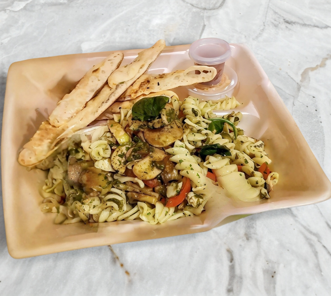 Pasta en salsa pesto, jitomate, champiñón, espinaca y pollo acompañada de nuestra focaccia recién hecha.
