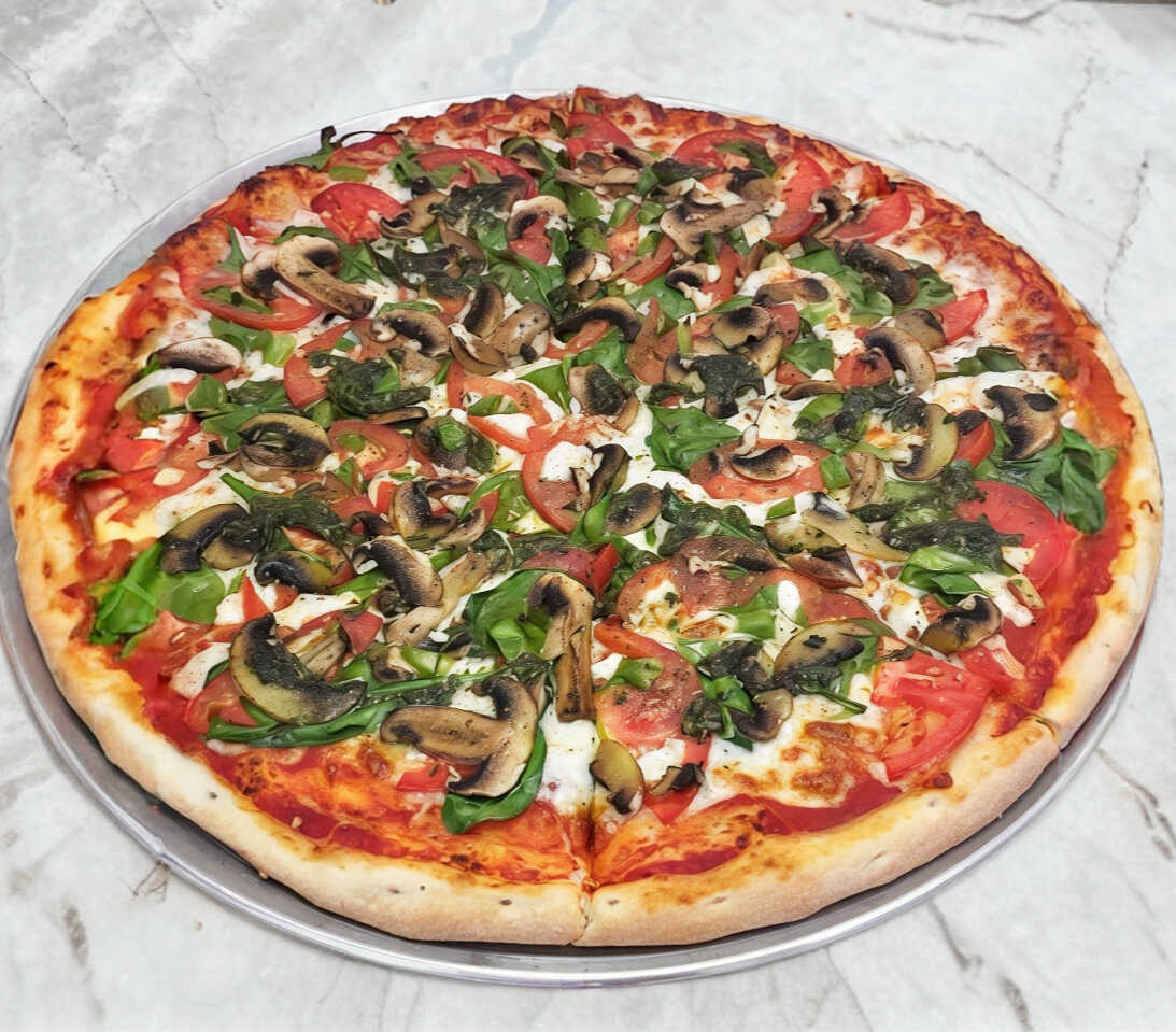 Espinaca, jitomate, champiñón fresco, pimiento y pesto.