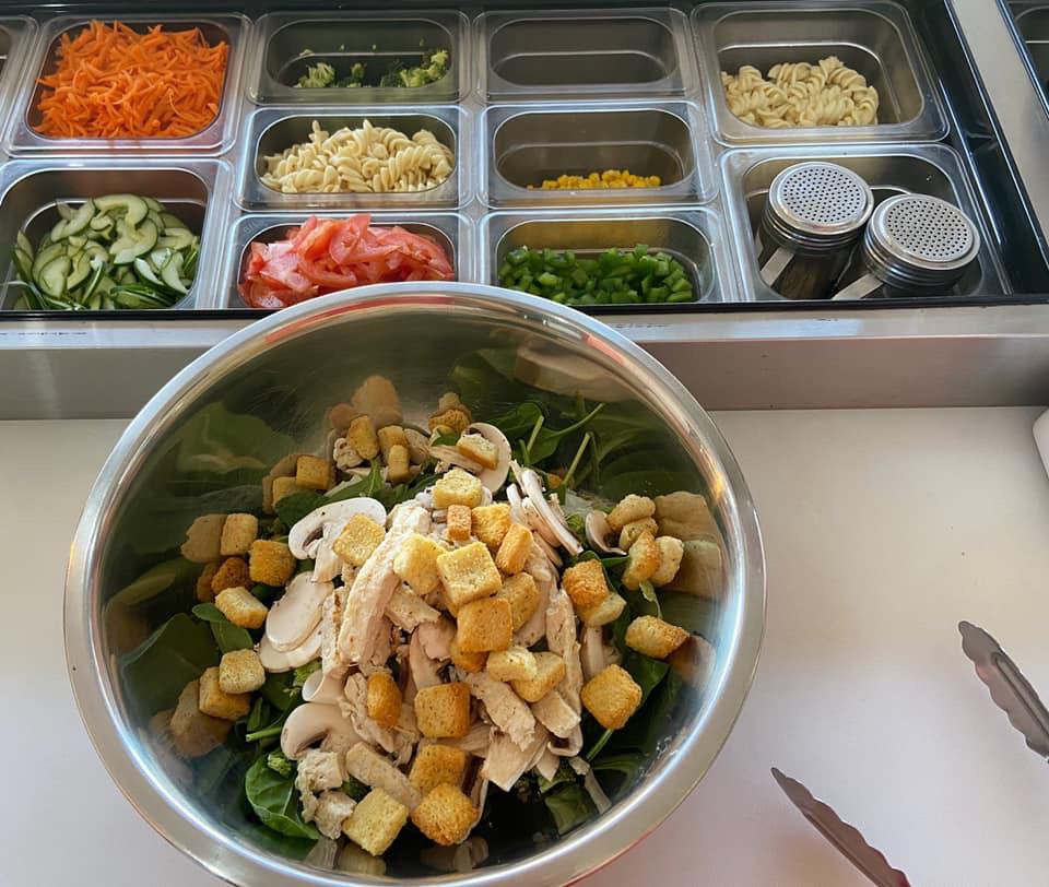 Base de mix de lechugas acompañadas de 5 porciones de barra fría, 150 gr. de proteína, toppings y aderezo.