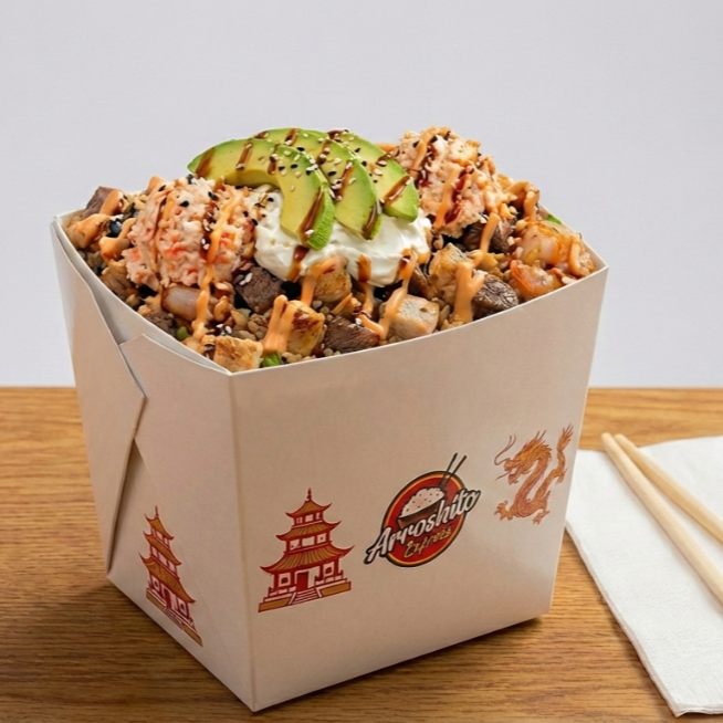 Arroz frito con pollo, cebollín, en el medio pollo oriental y Tampico coronado con aguacate y Philadelphia y Tampico. Salseado teriyaki y sriracha, aderezo spicy.