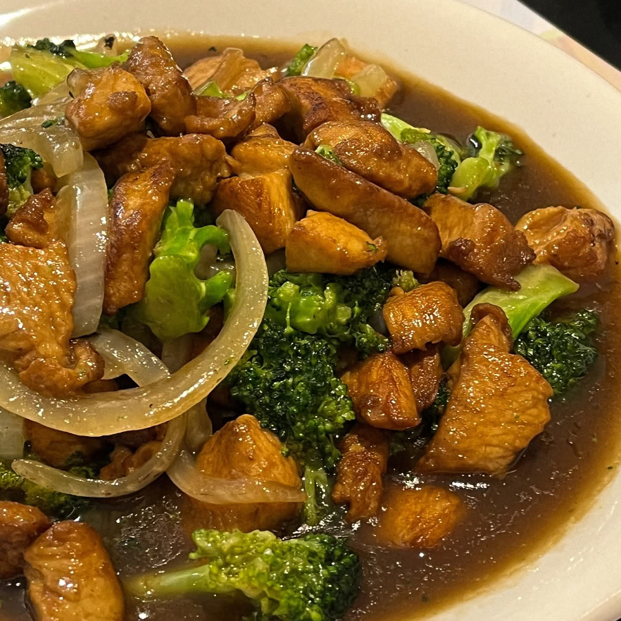 1 Lt Pollo en salsa de patio con brócoli y cebolla acompañado de arroz blanco y chiles toreados