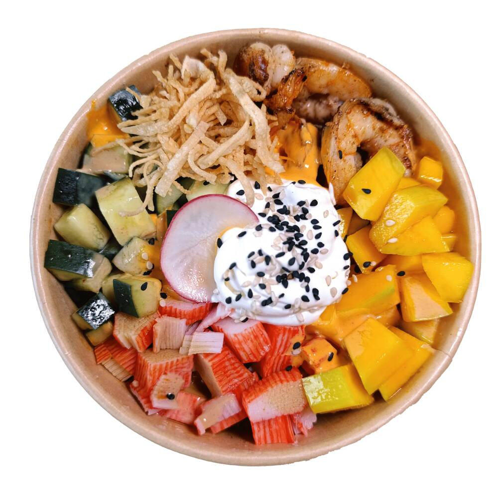 Base de arroz blanco con camarón, tsurimi, pepino, mango y queso crema, acompañado con aderezo ponzu de la casa + spicy mayo + tailandés y de topping ajonjolí.