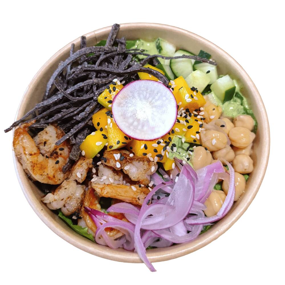 Base de mix de lechugas con camarón, pepino, garbanzo, cebolla morada y mango, acompañado con aderezo de cilantro y de topping tortilla frita + ajonjolí.
