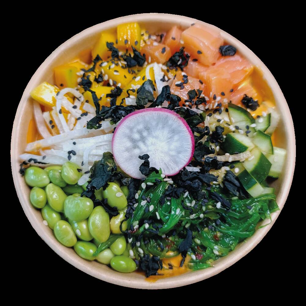 Base de arroz, salmón, mango, jícama, edamame, pepino y wakame fresco, acompañado con aderezo ponzu de la casa + spicy mayo y de topping wakame crujiente y ajonjolí.