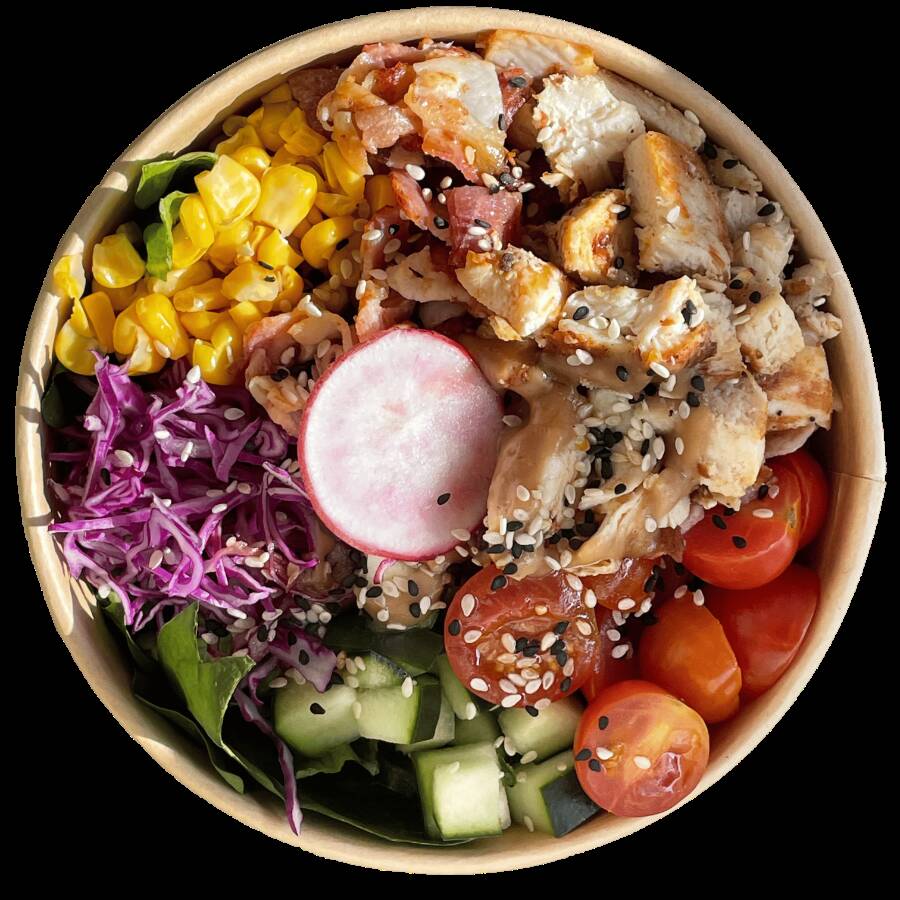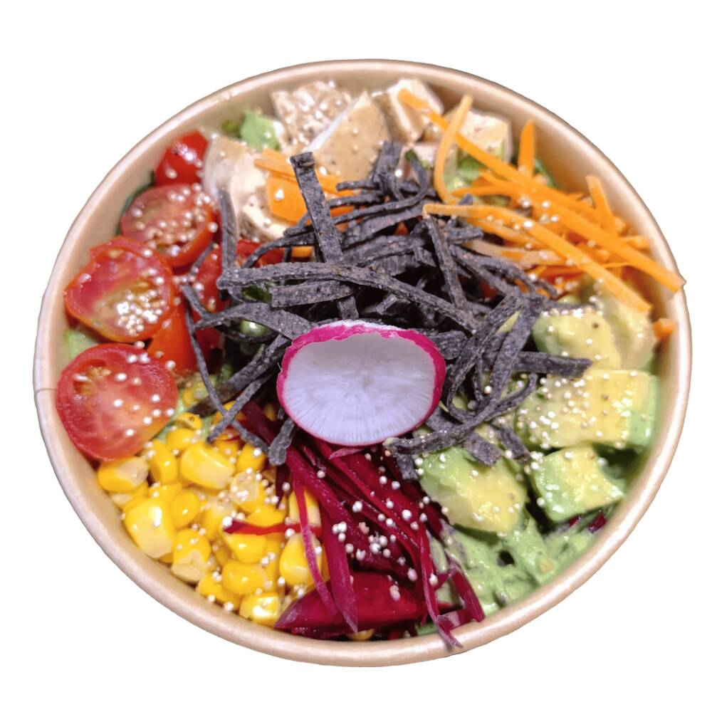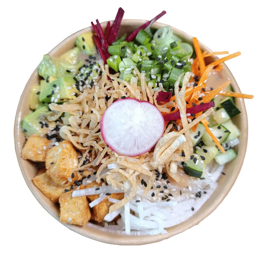 Base de arroz con quinoa, tofu, jícama, pepino, zanahoria, betabel, aguacate y cebollín, acompañado de aderezo agridulce + ajo rostizado y de topping ajonjolí y wonton frito.