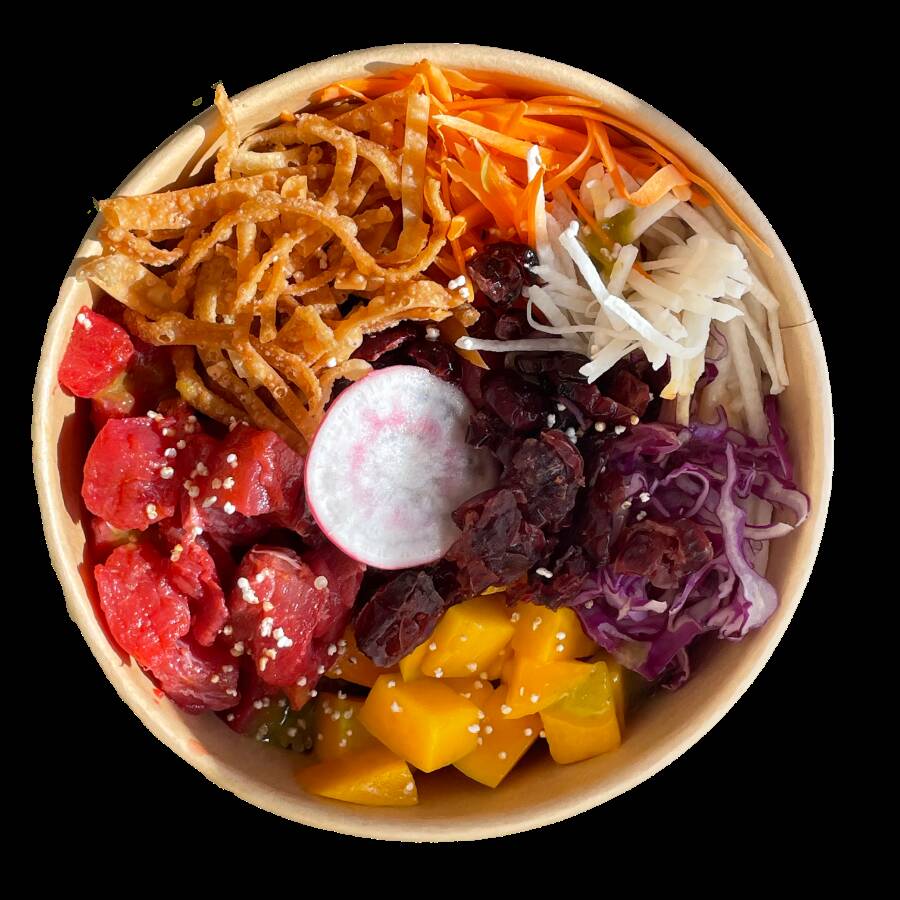 Base de quinoa con atún, mango, zanahoria, col morada y jícama con aderezo ponzu de la casa + mango jalapeño y de topping arándanos + wonton frito.