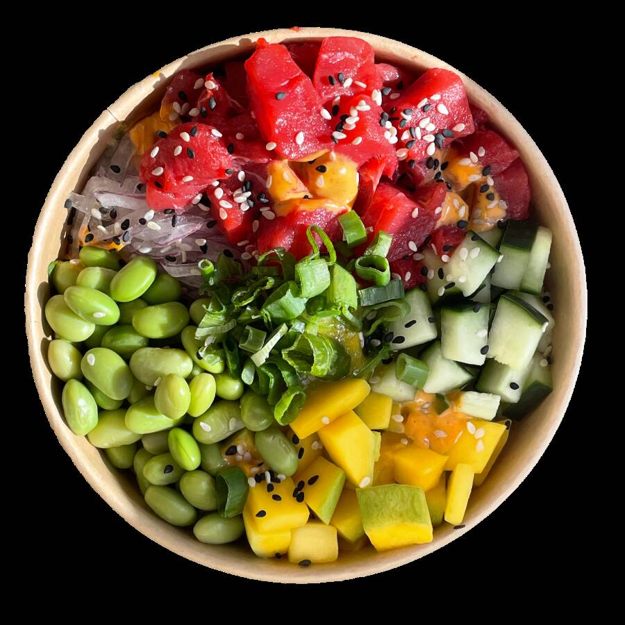 Base de arroz con mix de lechugas, atún, mango, pepino, cebolla morada, edamame, acompañado con aderezo de mango jalapeño + spicy mayo y de topping ajonjolí y cebollín.
