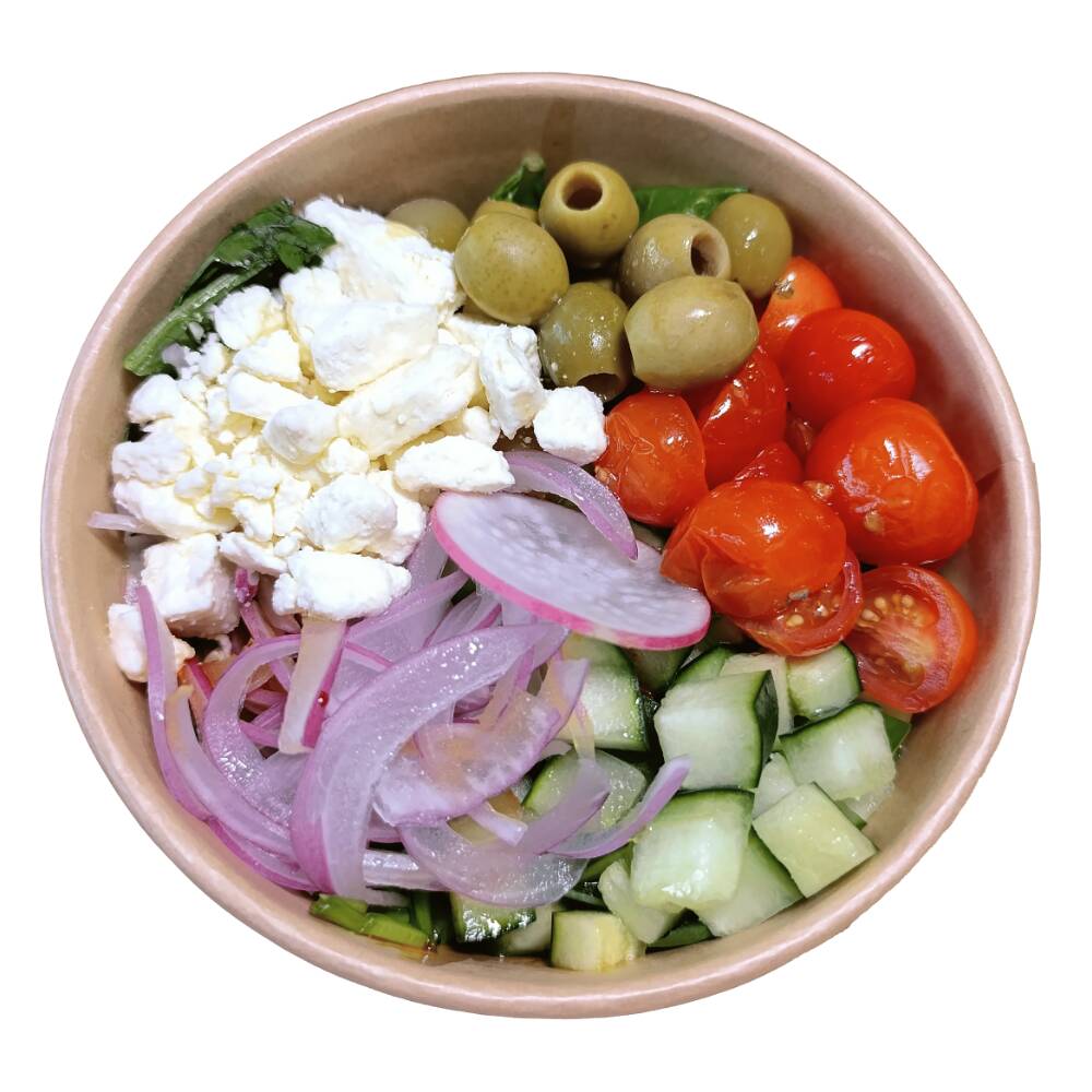base de mix de lechugas con queso feta, pepino, jitomate cherry, aceitunas y cebolla morada, acompañado de aderezo ponzu de la casa + aceite de oliva y de topping orégano seco + ajonjolí.