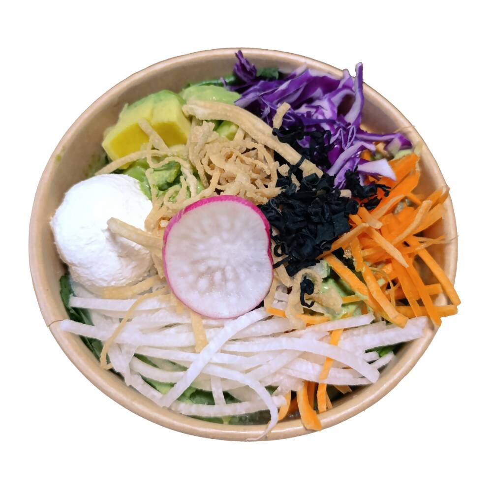Base de mix de lechugas con queso de cabra, zanahoria, jícama, col morada y aguacate, acompañado con aderezo mango jalapeño y de topping wakame crujiente + wonton frito.