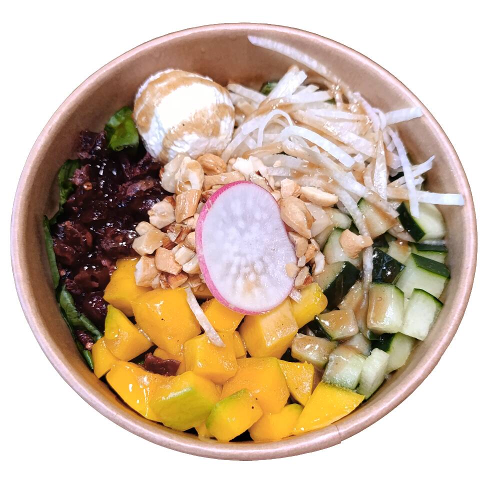 Base de mix de lechugas, queso de cabra, mango, jícama, pepino y zanahoria, acompañado con aderezo balsámico y de topping arándanos + mix de nueces.