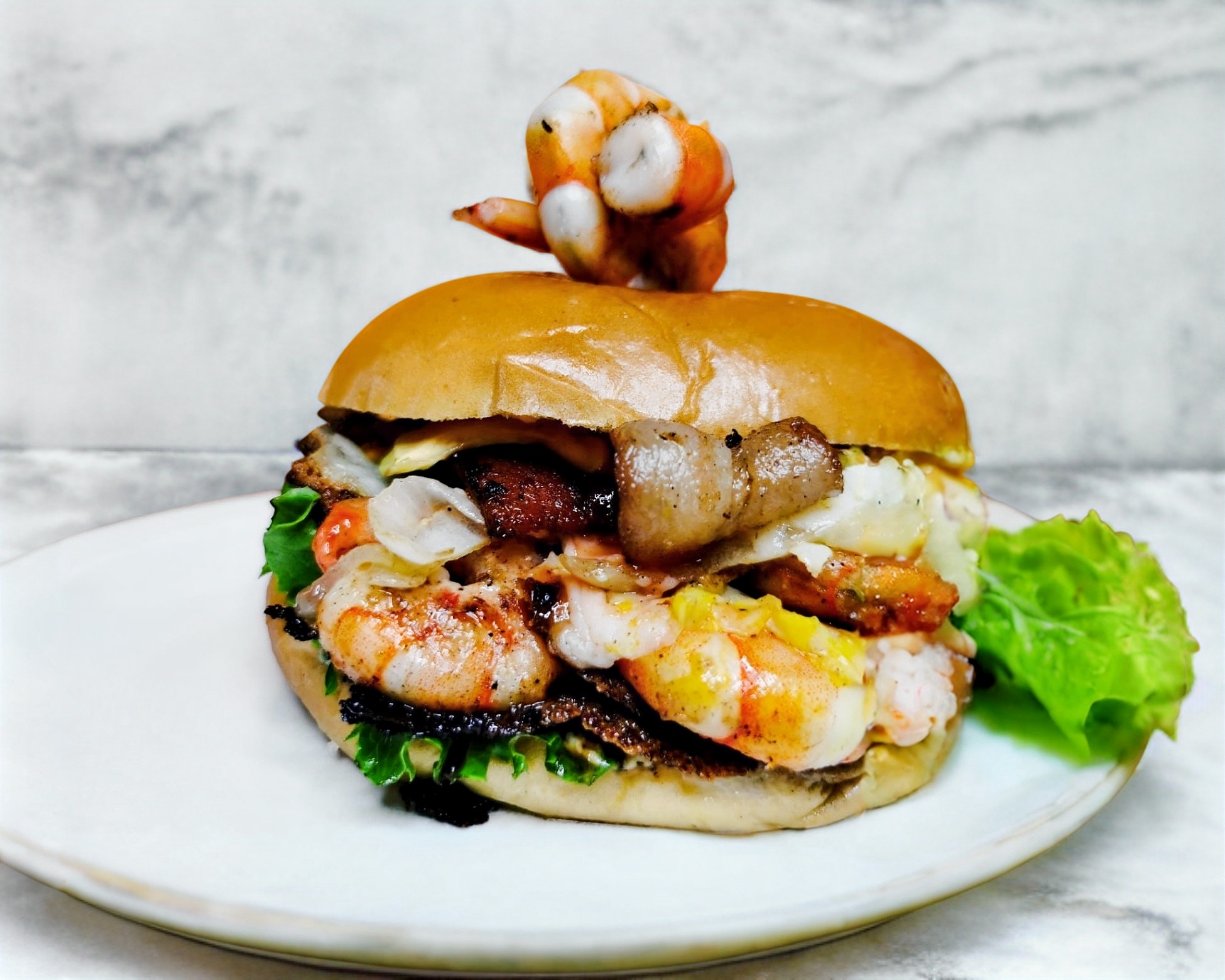 100 Grs. de camarón montados en 125 grs. de res, queso mozzarella, tomate, cebolla, lechuga y aguacate.