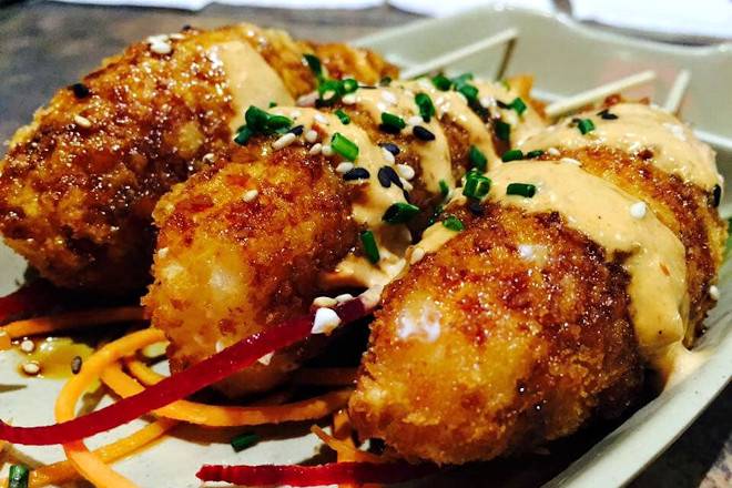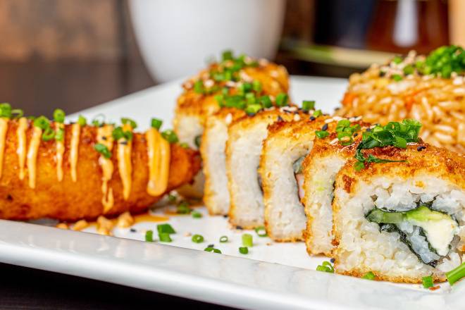 Arroz frito, aguacate, queso crema, salsa de anguila, ajonjolí y la proteina empanizada de tu elección.