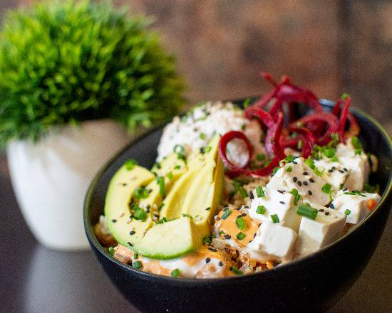 Arroz frito con verduras sazonadas, servido con queso philadelphia, aguacate, aderezo tampico y chipotle más el ingrediente de tu elección.