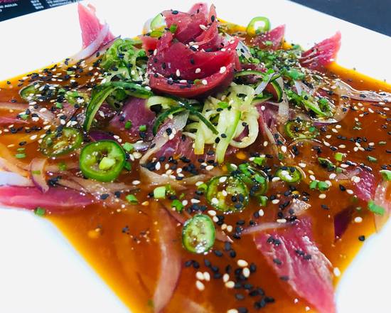 Finas rebanadas de tuna fresca, sobre una cama de pepino, julianas de cebolla morada, rodajas de chile serrano, condimentado y bañado en salsas de soya suprema y serranito