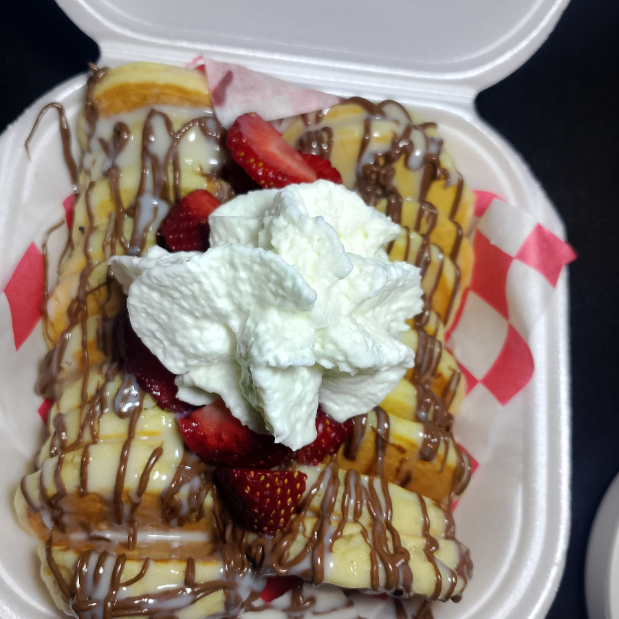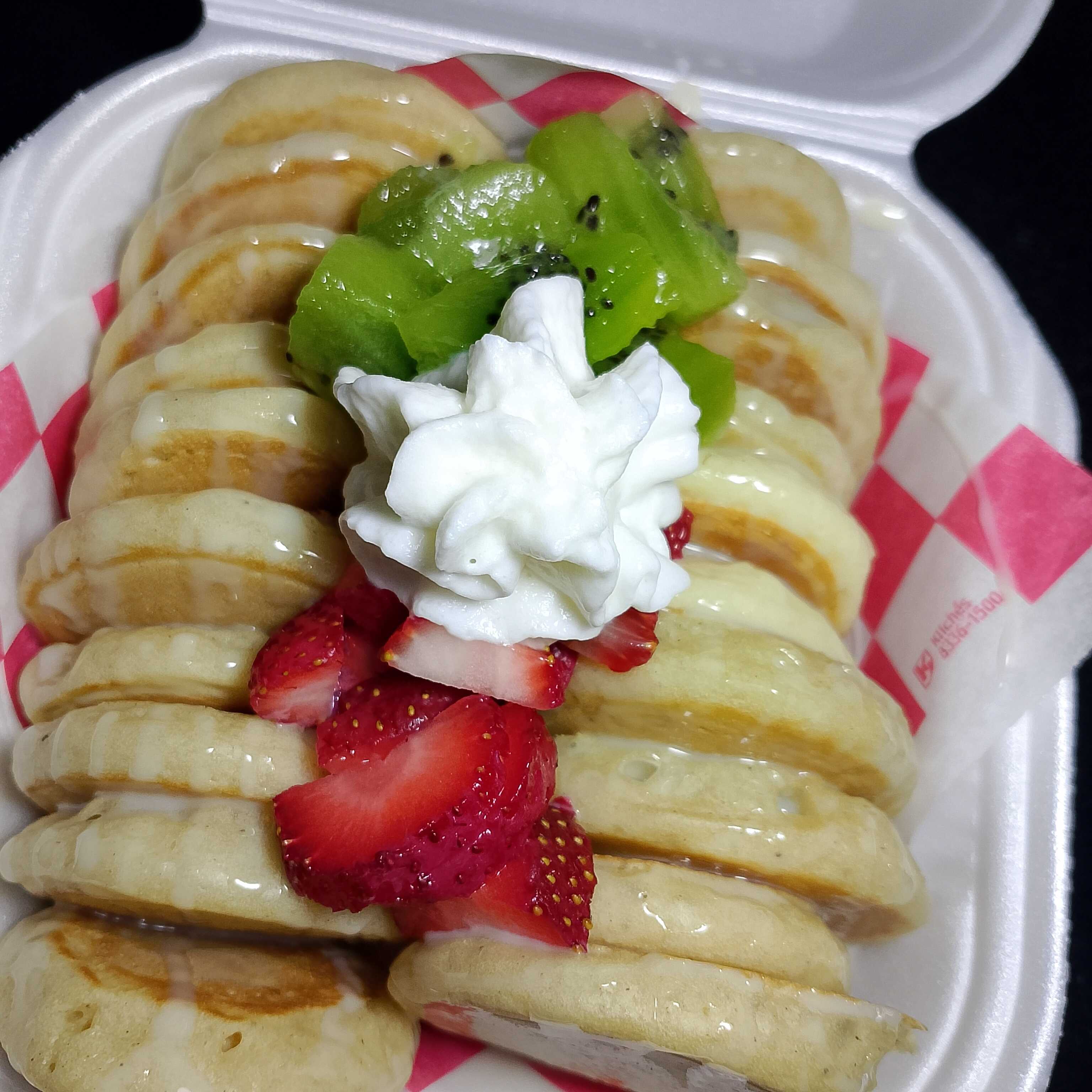 Mini hotcakes con fresas, crema batida y lechera