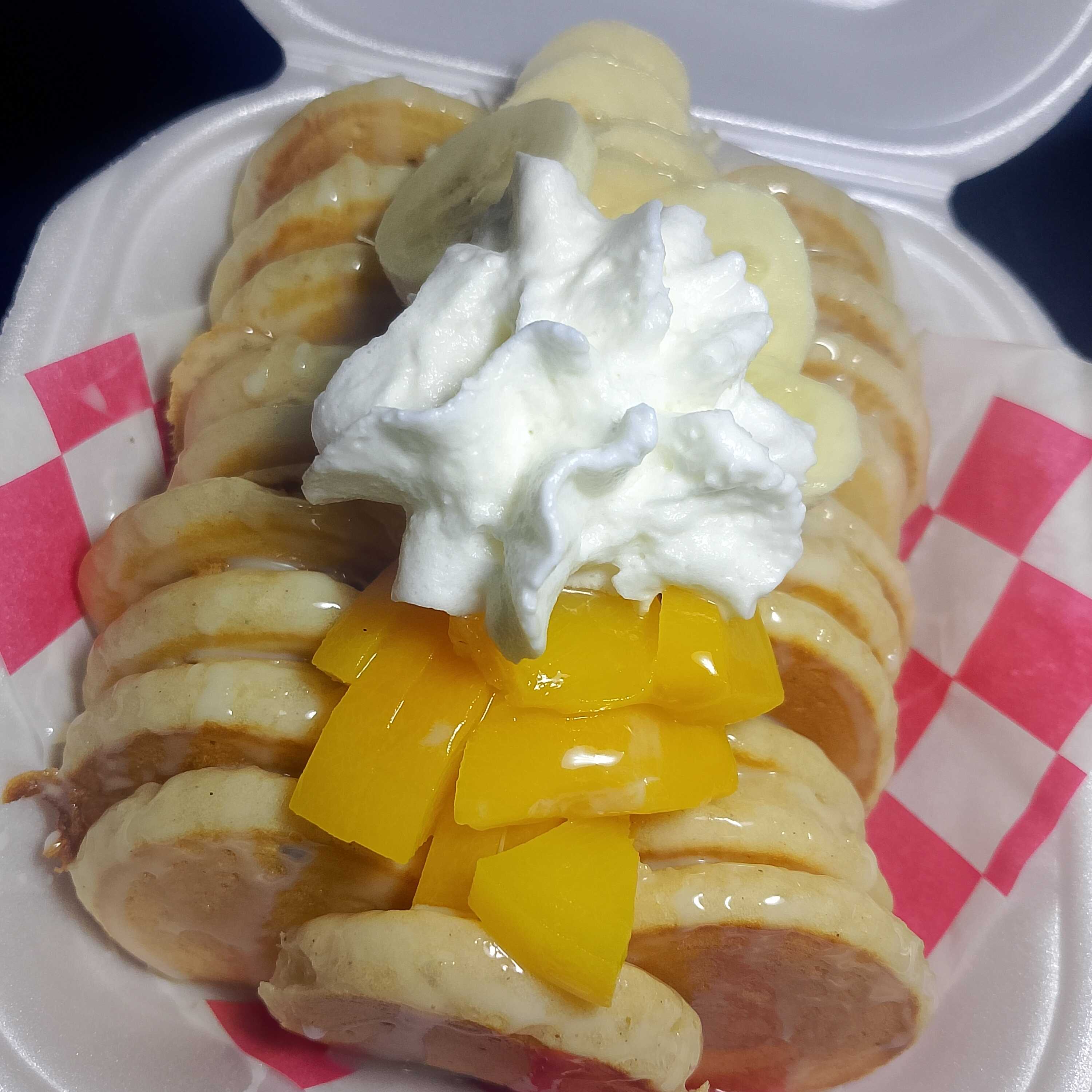 Mini hotcakes con durazno, crema batida y lechera