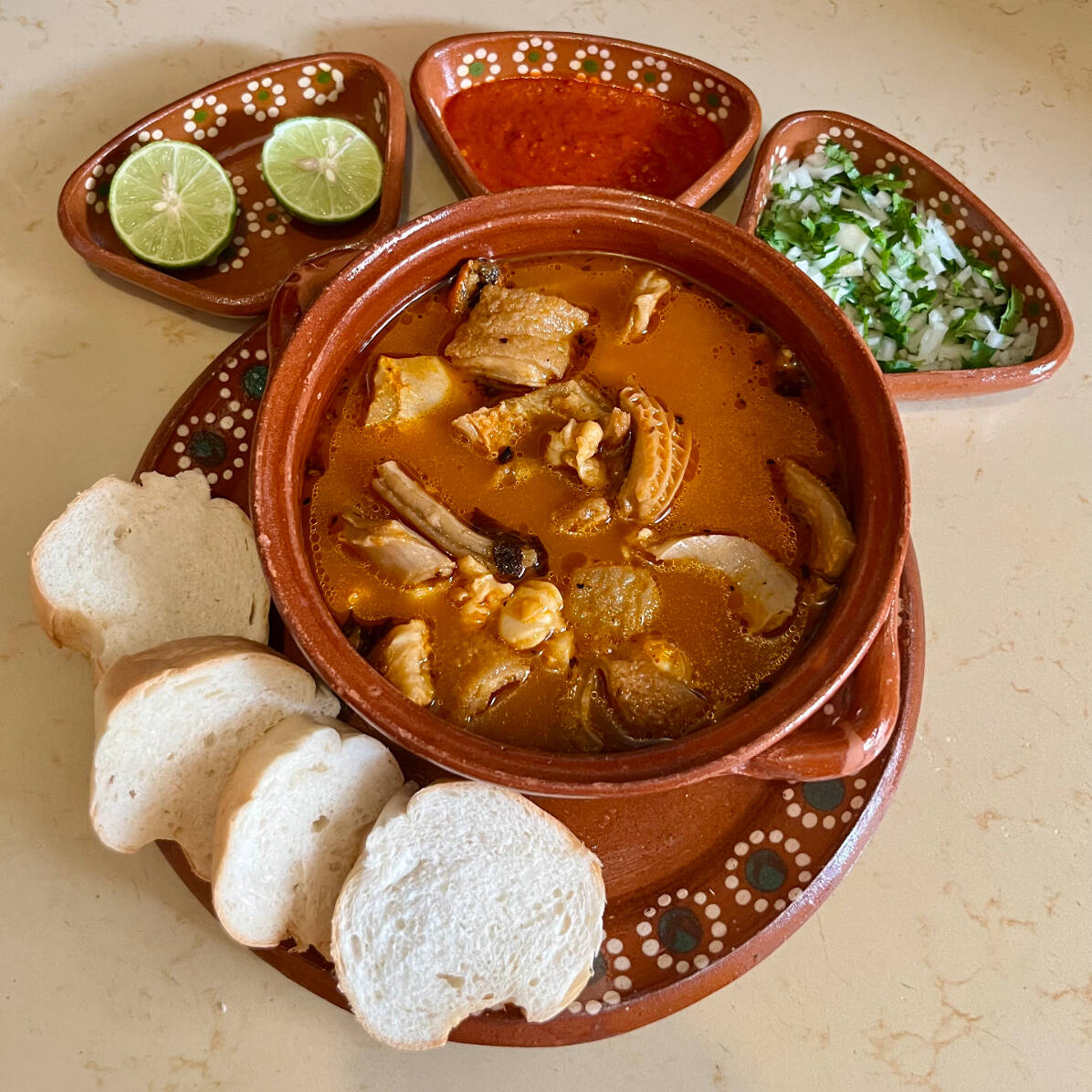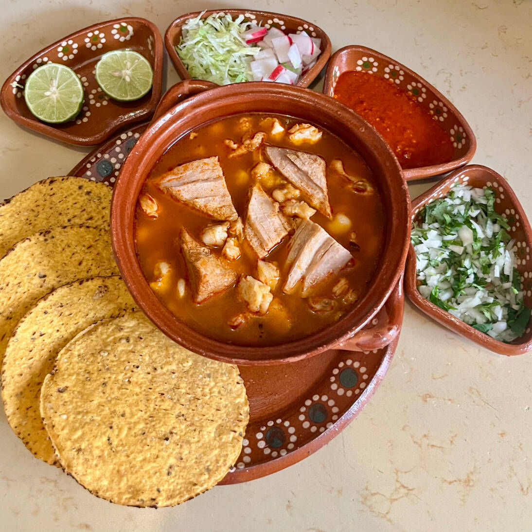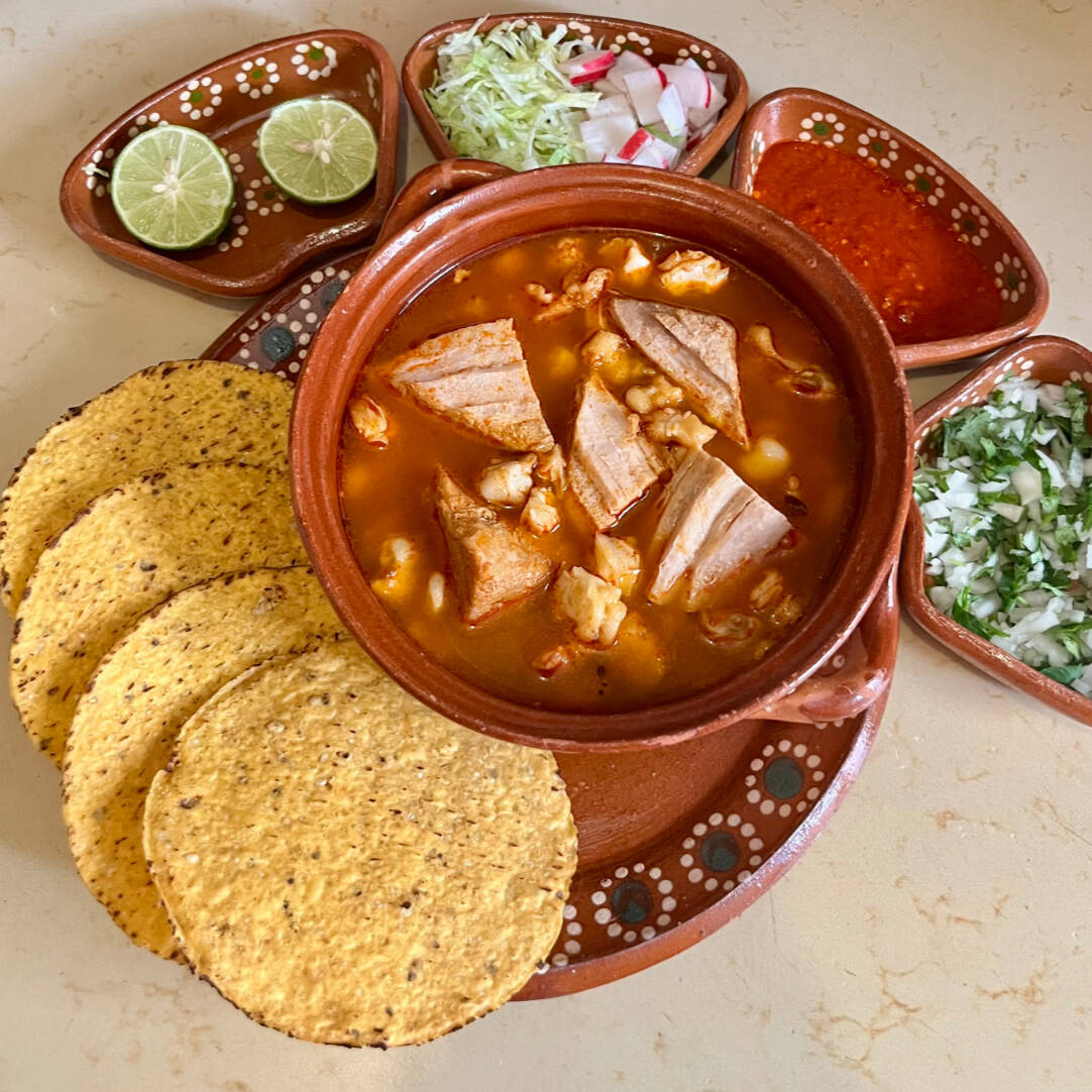 Pozole rojo de puerco. Incluye tostadas, cebolla, cilantro, lechuga, rábano, limones y salsa picante.