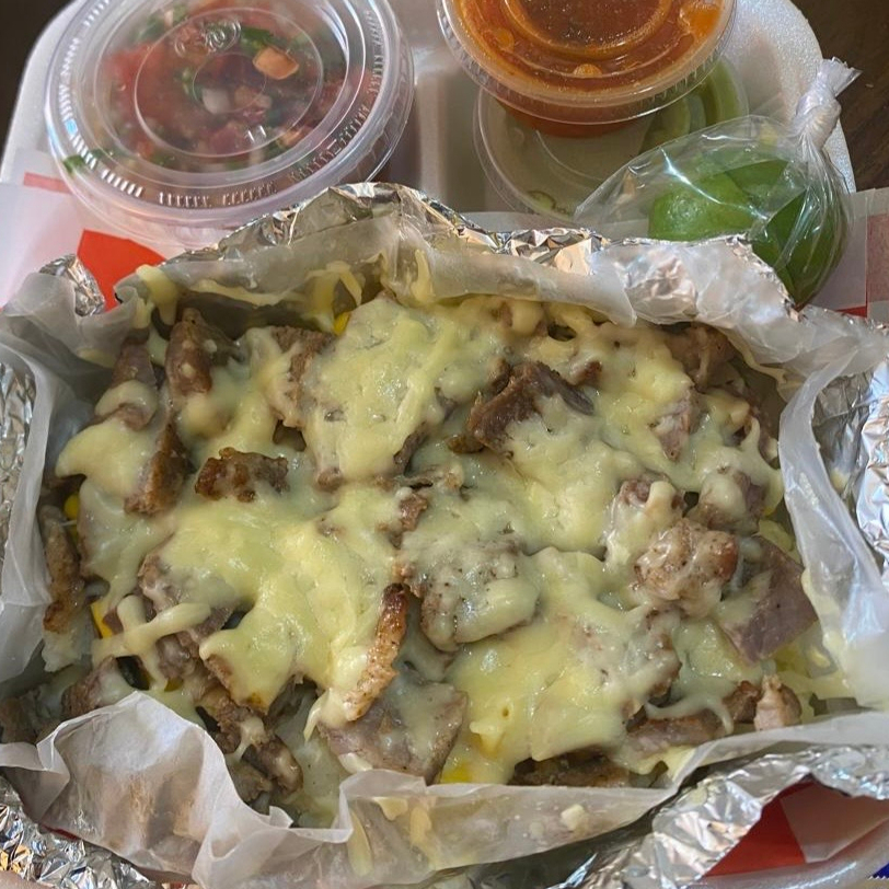 Papa rellena de carne asada, elotes, champiñones, mantequilla y queso gratinado. Incluye Tortillas de harina 5, guacamole, salsa roja picante y salsa mexicana.