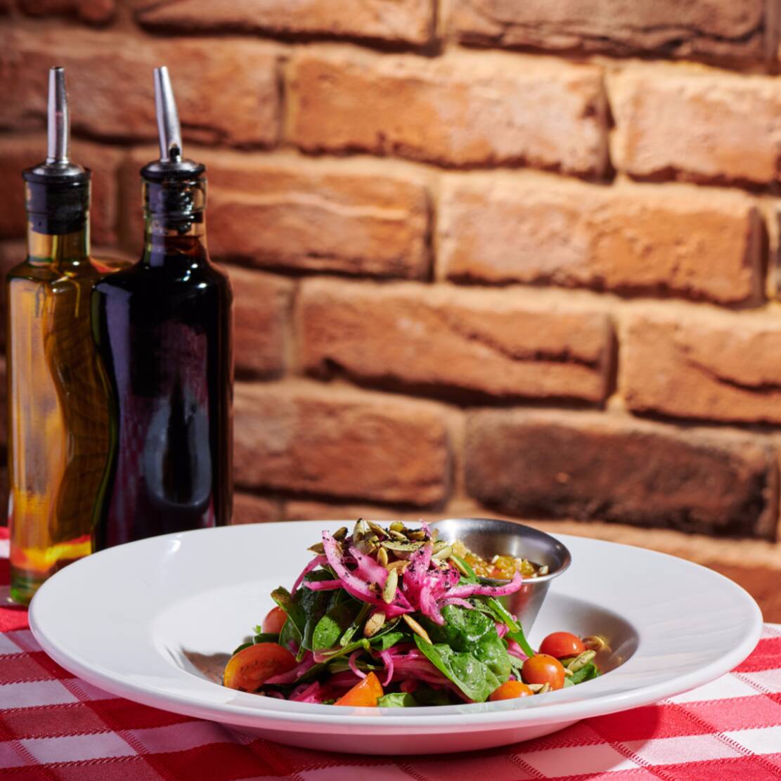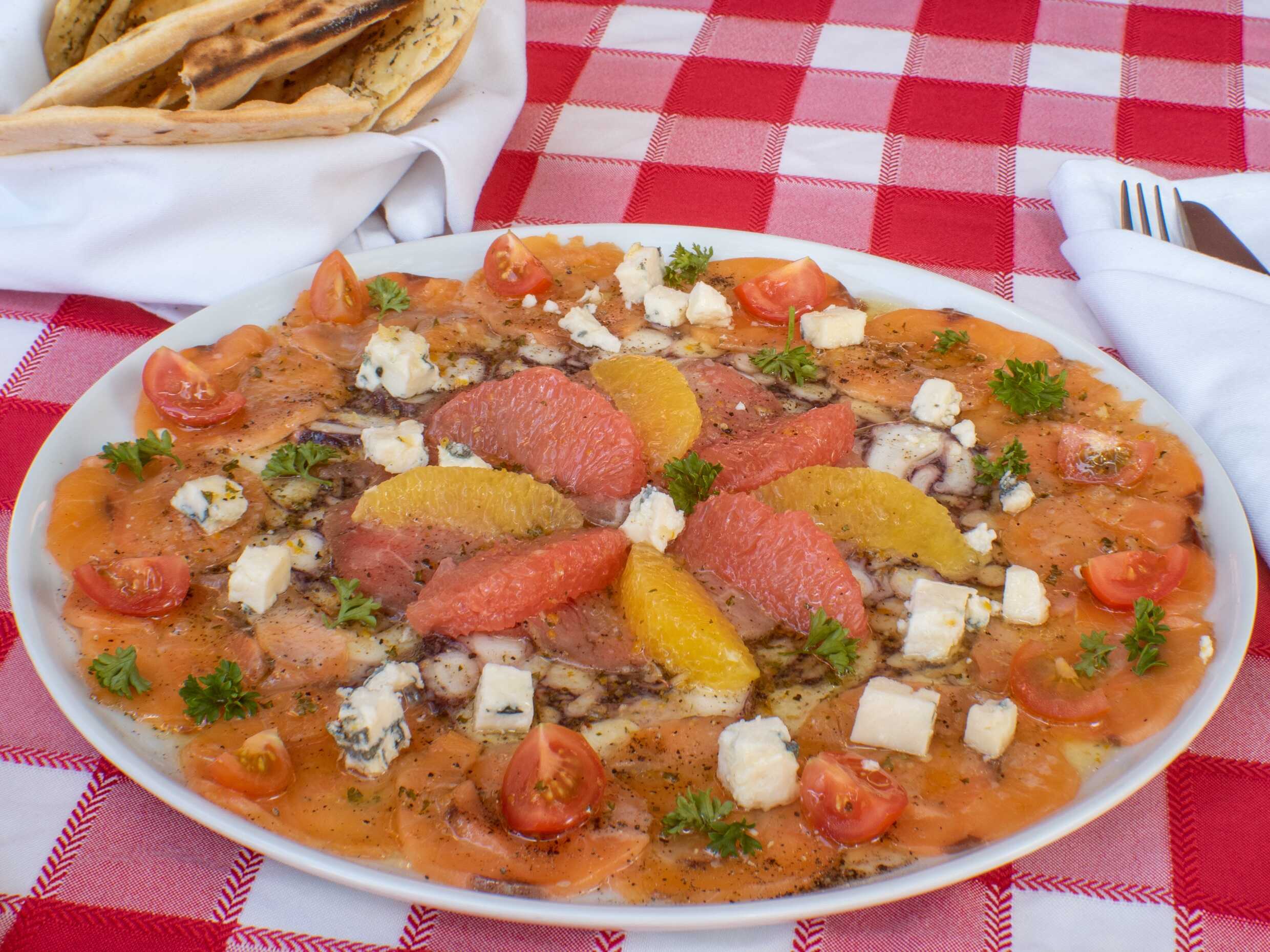 Salteado al vino blanco, aceituna, kalamata, aceituna verde, alcaparras, albahaca y perejil.