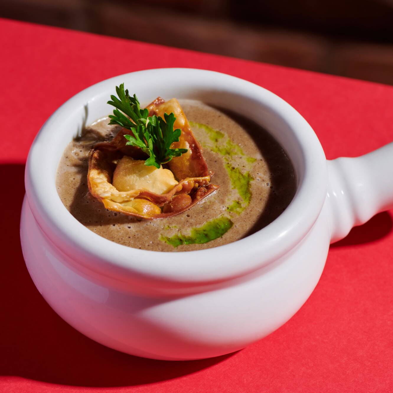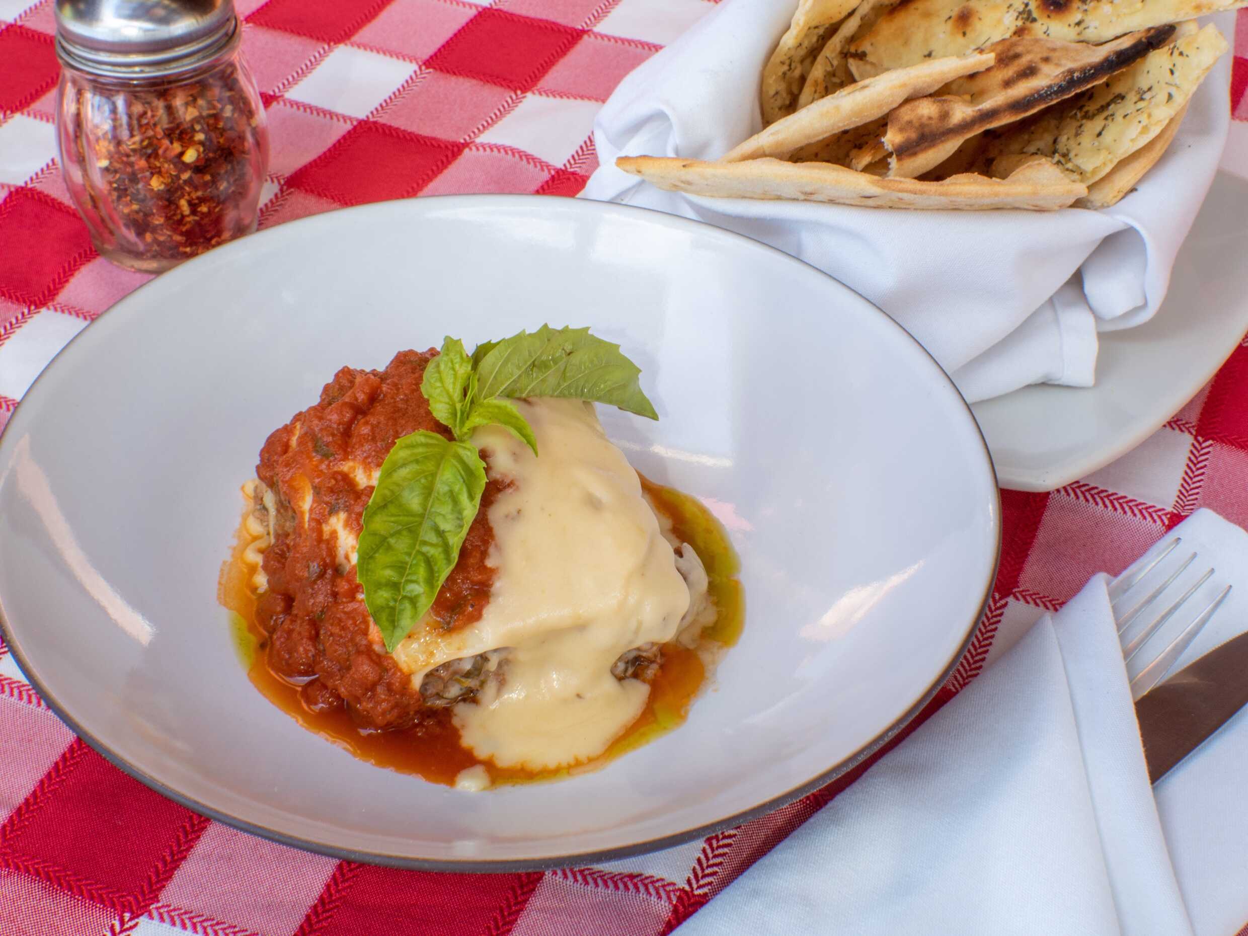 Tradicional lasagna rellena de carne acompañada con un dúo de salsas de perejil picado y aceite verde.