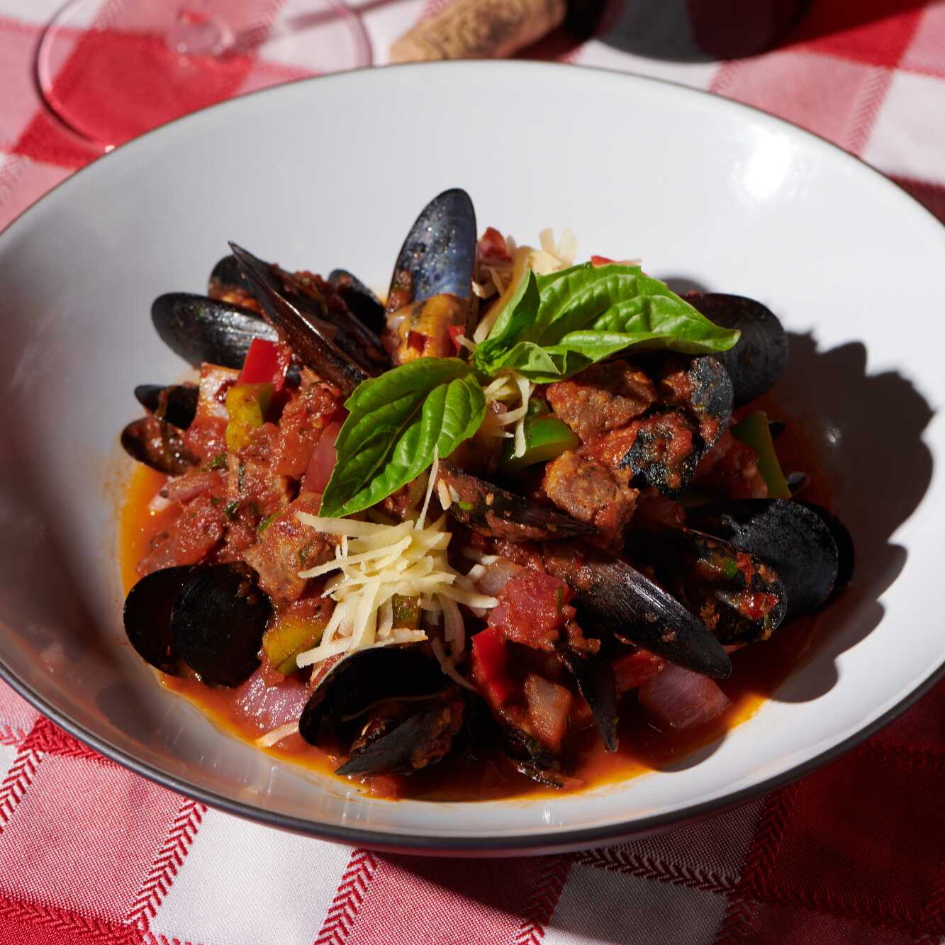 Mezcla de mejillones negros, salchicha italiana, pimientos, cebolla morada, albahaca, perejil, chile quebrado, vino blanco y salsa de tomate.